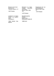 Ministerium des Innern Ministerium für Arbeit, Staatskanzlei des Lan− Henning−von− Soziales, Gesundheit des Brandenburg Tresckow−Straße 9 −13 und Frauen Heinrich−Mann−Allee Heinrich−Mann−Allee 107 14467 Potsdam 103 14473 Potsdam 14473 Potsdam Landesamt für Bauen, Brandenburgisches Verkehr und Straßen− Straßen− wesen bauamt Kyritz Lindenallee 51 Holzhausener Straße 58 15366 Dahlwitz Hop− 16866 Kyritz pegarten