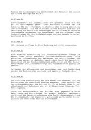Landtag Brandenburg Drucksache 3/3615 3. Wahlperiode Antwort der Landesregierung auf die Kleine Anfrage Nr. 1338 des Abgeordneten Michael Claus Fraktion der DVU Drucksache 3/3474 Kann die Polizei entlastet werden? Wortlaut der Kleinen Anfrage Nr. 1338 vom 22.10.2001: Die Polizei trägt die Hauptlast bei der Bekämpfung der Krimina- lität. Angesichts des neuaufkommenen Terrorismus und den damit verbundenen Sicherheitslagen stellt sich die Frage, ob polizei- liche Aufgaben stärker durch Fachverwaltungen übernommen werden können. Als Beispiele seien genannt: Feststellung von Schäden an Ver- kehrseinrichtungen, illegale Müllablagerungen, Entwertung von KfZ - Zeichen, abgestellte und nichtzugelassene Fahrzeuge auf öffentlichen Straßen, Erfassung und Auswertung von Verkehrsun- fällen, Sperrzeitüberschreitungen, Kontrolle von Baustellenab- sperrungen oder nächtliche Ruhestörungen. Angesichts der Bemühungen um die Haushaltskonsolidierung ist es auch fraglich, ob eine Aufstockung der Polizeikräfte des Landes möglich ist. Ich frage die Landesregierung: 1. In welchen Schwerpunktbereichen sollte die Polizei des Landes nach den Reformvorstellungen der Landesregierung auf jeden Fall tätig sein? 2. Welche bislang ausgeübten hoheitlichen Aufgaben könnten auf andere Fachbehörden übertragen oder privatisiert werden? 3. Was hat die Landesregierung bislang konkret unternommen, um die Polizeibeamten auf die Terrorismusgefahr vorzubereiten? 4. Werden die Beamten besonders geschult, um Gefahren abzuweh- ren, die im Bereich der biologischen und chemischen Waffen liegen, soweit sie von Terroristen eingesetzt werden? Datum des Eingangs: 05.12.2001 / Ausgegeben: 11.12.2001