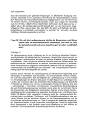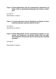 Frage 13: Welche Möglichkeiten sieht die Landesregierung, Bürgerinnen und Bürger direkt an Haushaltsentscheidungen des Landes zu beteili− gen? Zu Frage 13: Siehe Antwort zu Frage 12 Frage 14: In welchen Bereichen sollte die Beteiligung von Bürgern an Haus− haltsentscheidungen besonders gefördert werden? Zu Frage 14: Siehe Antwort zu Frage 12 Frage 15: Welche Möglichkeiten will die Landesregierung ergreifen, um ge− genüber den Bürgerinnen und Bürgern jeweils direkt und allge− meinverständlich Rechenschaft über die Umsetzung des Haushaltes abzulegen? Zu Frage 15: Siehe Antwort zu Frage 12