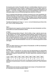Die Auswertung jeder einzelnen Personalakte stellt einen unverhältnismäßigen Aufwand dar und ist in der für die Beantwortung der Kleinen Anfrage zur Verfügung stehenden Zeit nicht möglich. Darüber hin - aus stehen Personalakten inzwischen wieder aus dem Landesdienst ausgeschiedener Beamtinnen und Beamter z. T. nicht mehr zur Verfügung. Dieses gilt auch für Personalunterlagen im Rahmen der Ver - waltungshilfe lediglich an das Land Brandenburg abgeordneter Beamtinnen und Beamter. Noch im Landesdienst aktive Beamtinnen und Beamte mit Herkunft aus den „alten“ Bundesländern (ein - schließlich Berlin-West), konnten indirekt durch Auswertung von Merkmalen der Verfahren zur Zahlbar- machung der Dienstbezüge ermittelt werden. Auf dieser Grundlage und durch ergänzende Durchsicht eines Teils der Personalakten der im Landesdienst tätigen Beamtinnen/Beamten wurden Erkenntnisse zur Beantwortung der Fragen zu 2. und zu 4. gewonnen. Hinsichtlich der Beantwortung der Fragen zu 1. und zu 3., wird auf die Beantwortung der Kleinen Anfra - ge Nr. 1592, Ds 2/4946, Bezug genommen. Frage 1: Wie viele Beamte kamen insgesamt aus Nordrhein-Westfalen oder anderen Bundesländern nach Bran- denburg (Bitte nach einzelnen Bundesländern auflisten) zu Frage 1: Aus der Beantwortung der Kleinen Anfrage Nr. 1592, Ds 2/4946, zu Frage 1, ergibt sich, dass bis Janu - ar 1998 insgesamt 1.979 Personen, überwiegend Beamtinnen/Beamte, Richterinnen/Richter und Pro - fessorinnen/Professoren aus dem öffentlichen Dienst des alten Bundesgebietes in den Brandenburgi- schen Landesdienst übernommen wurden. Es ist davon auszugehen, dass sich diese Zahl bis zum Ende des Jahres 1998 (Ende der Verwaltungshilfe) nicht wesentlich erhöht hat. Die erbetene Differen - zierung nach einzelnen Herkunfts-Bundesländern ist aus den in der Vorbemerkung genannten Gründen nicht möglich. Frage 2: Wie war die zeitliche Streckung und wann endete der Personaltransfer von NRW nach Brandenburg? (bitte nach einzelnen Jahren auflisten) zu Frage 2: Diese Frage kann nur hinsichtlich der noch aktiven (also ohne Berücksichtigung der zwischenzeitlich aus dem – aktiven – Landesdienst ausgeschiedenen) Beamtinnen/Beamten, Richterinnen/Richter und Professorinnen/Professoren beantwortet werden. Die aktuell vorgenommene Auswertung hat folgende Daten ergeben: Jahr 1990 1991 1992 1993 1994 1995 1996 1997 1998 An- 0 13 58 81 51 37 36 12 12 zahl *berücksichtigt sind alle noch aktiven bis Ende 1998 aus NRW in den Brandenburgischen Landesdienst übergetretenen Beamtinnen/Beamte, Richterinnen/Richter und Professorinnen/Professoren. In der Kürze der zur Verfügung stehenden Zeit konnten die Werte z. T. lediglich näherungsweise er- mittelt werden Frage 3: Welche Bereiche waren besonders und welche Bereiche waren weniger vom Personaltransfer betrof- fen? (bitte getrennt nach einzelnen Ministerien auflisten) Seite 2 von 3