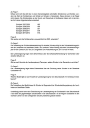 2 Zu Frage 1: Erfasst wird nicht die Zahl der in einem Gemeindegebiet wohnhaften Schülerinnen und Schüler, son - dern die Zahl der Schülerinnen und Schüler an Schulen in Gemeinden. Diese stimmen in der Regel nicht überein. Die Schülerzahlen an der Grund- und Oberschule in Großbeeren haben sich in den letz- ten fünf Jahren folgendermaßen entwickelt: Schuljahr 2007/2008 465 Schuljahr 2008/2009 486 Schuljahr 2009/2010 551 Schuljahr 2010/2011 576 Schuljahr 2011/2012 615. Frage 2: Wie werden sich die Schülerzahlen voraussichtlich bis 2020 entwickeln? Zu Frage 2: Die Darstellung der Schülerzahlenentwicklung für einzelne Schulen erfolgt in den Schulentwicklungsplä - nen der Landkreise und kreisfreien Städte. Der Landkreis Teltow-Fläming hat einen Schulentwicklungs- plan für den Zeitraum 2007 bis 2012 aufgestellt. Eine Fortschreibung bis 2017 ist noch in Arbeit. Der Landesregierung liegen keine Erkenntnisse über die Schülerzahlentwicklung für Gemeinden oder einzelne Schulen vor. Frage 3: Gibt es nach Kenntnis der Landesregierung Planungen, weitere Schulen in der Gemeinde zu errichten? Zu Frage 3: Der Landesregierung liegen keine Erkenntnisse über die Errichtung neuer Schulen in der Gemeinde Großbeeren vor. Frage 4: Welchen Bedarf gibt es nach Ansicht der Landesregierung für eine Sekundarstufe II im Großraum Groß- beeren? Zu Frage 4: Die Feststellung des Bedürfnisses für Schulen ist Gegenstand der Schulentwicklungsplanung der Land- kreise und kreisfreien Städte. Unabhängig davon kann nach Einschätzung der Landesregierung der Schulbedarf in der Sekundarstufe II auf Basis der gegenwärtigen Schülerzahlen in der Sekundarstufe I in der Region Großbeeren in den nächsten Jahren von den umliegenden Schulen problemlos gedeckt werden.