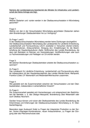 Namens der Landesregierung beantwortet der Minister für Infrastruktur und Landwirt- schaft die Kleine Anfrage wie folgt: Frage 1: Welche Obstarten und –sorten werden in der Obstbauversuchsstation in Müncheberg gezüchtet? Frage 2: Welche von den in der Versuchsstation Müncheberg gezüchteten Obstsorten stehen allen Brandenburger Obstbaubetrieben frei zur Verfügung? Zu Frage 1 und 2: In der Obstbauversuchsstation Müncheberg werden keine Züchtungen durchgeführt. Die Obstbauversuchsstation Müncheberg des Landesamtes für Ländliche Entwicklung, Landwirtschaft und Flurneuordnung (LELF) erarbeitet in Versuchen (Sorten-Unterla- gen-Kombinationen, Anbauverfahren, Düngung etc.) Empfehlungen für die Bewirt- schaftung der Hauptanbaukulturen (Apfel, Süßkirsche) des Landes Brandenburg, die dann den Betrieben im Rahmen von Veranstaltungen, Veröffentlichungen oder auch zu Fachveranstaltungen und Feldtagen vor Ort erörtert werden. Frage 3: Mit welchen Brandenburger Obstbaubetrieben arbeitet die Obstbauversuchsstation zu- sammen? Zu Frage 3: Das Landesamt für Ländliche Entwicklung, Landwirtschaft und Flurneuordnung arbei- tet insbesondere mit den Hauptanbauregionen des Landes Werder/Havel, Marquardt, Frankfurt (Oder) OT Markendorf und Wesendahl/Werneuchen zusammen. Frage 4: Wie gestaltet sich die Zusammenarbeit zwischen der Versuchsstation und den Obst- baubetrieben, insbesondere in wirtschaftlicher Hinsicht? Zu Frage 4: Die Zusammenarbeit gestaltet sich themenbezogen und entsprechend den Bedürfnis- sen der Betriebe, u. a. das Obstgut Marquardt, Brandenburg Obst Wesendahl oder auch Obstbau Neumann. Darüber hinaus können und nutzen alle Obstbaubetriebe des Landes Brandenburg die Erkenntnisse und Erfahrungen der Obstbauversuchsstation Müncheberg (z. B. Obst- baufachtagung). Besonders reger Austausch findet zu Fragen der Integrierten Produktion zu den Sor- ten, Sorten-Unterlagen-Kombinationen, neuen Anbauverfahren, zu Fragen der Dün- gung oder des Pflanzenschutzes statt. 2
