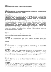 Landtag Brandenburg Drucksache 5/3057 5. Wahlperiode Antwort der Landesregierung auf die Kleine Anfrage 1133 des Abgeordneten Steeven Bretz CDU-Fraktion Drucksache 5/2896 Wortlaut der Kleinen Anfrage 1133 vom 04.03.2011: Sanierung der Humboldtbrücke in Potsdam Die Humboldtbrücke in Potsdam muss in den nächsten Jahren weiter saniert werden. Laut aktuellen Presseberichten werden die Kosten für die Sanierung der stadteinwärts führenden Spuren auf 21 Millionen Euro geschätzt. Nach Angaben des Infrastrukturministeriums könnten 75% der Kosten für den Straßenkörper über das Entflechtungsgesetz gefördert werden. Dennoch gibt es offenbar Unklarheiten zwischen der Stadt Potsdam und dem Land Brandenburg über die Kostenverteilung. Ich frage die Landesregierung: 1. Wird sich die Landesregierung an den Sanierungskosten für die stadteinwärts führende Fahrbahn der Humboldtbrücke beteiligen? Wenn ja, in welcher Höhe? 2. Welche Bedingungen müssen für eine Förderung vorliegen? 3. Wie ist der Sachstand bezüglich der Antragstellung auf Förderung der Sanierungskosten der Humboldtbrücke durch die Stadt Potsdam? 4. Welche Probleme bestehen aus Sicht des Landes über die endgültige Kostenverteilung zwischen der Stadt Potsdam und dem Land Brandenburg? 5. Bis wann rechnet die Landesregierung mit der Instandsetzung der stadteinwärts führenden Spuren der Humboldtbrücke? 6. Wie viele Fördermittel hat das Land bisher für die Instandsetzung der Humboldtbrücke aufgewendet? Namens der Landesregierung beantwortet der Minister für Infrastruktur und Landwirtschaft die Kleine Anfrage wie folgt: Frage 1: Wird sich die Landesregierung an den Sanierungskosten für die stadteinwärts führende Fahrbahn der Humboldtbrücke beteiligen? Wenn ja, in welcher Höhe? Datum des Eingangs: 04.04.2011 / Ausgegeben: 11.04.2011