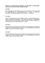 Namens der Landesregierung beantwortet die Ministerin für Wissenschaft, Forschung und Kultur die Kleine Anfrage wie folgt: Zu Frage 1: Die Landesregierung ist der Auffassung, dass es ihr gelungen ist, in der ersten Hälfte der Legislaturperiode die Forschungsinfrastruktur zu stärken und damit die Grundlagen eine wettbewerbsfähige Forschung weiter zu verbessern. Zu Frage 2: Hierzu wird insbesondere auf die Investitionen in Bau- und Erstausstattungen ver- wiesen. Umfangreiche Investitionen, in der Regel unter Einsatz von EFRE-Mitteln sowie Einwerbung von Bundesmitteln, trugen in den letzten Jahren maßgeblich zur Verbesserung der Forschungsinfrastruktur im Land bei. Zu Frage 3: Zur Beantwortung der Frage wird auf die Antwort der Landesregierung auf die Große Anfrage Nr. 22 "Außeruniversitäre Forschung im Land Brandenburg" (Drucksache 3/2897), Frage 20 vom Juni 2001 verwiesen. Zu Frage 4: Zur Beantwortung der Frage wird auf die Antwort der Landesregierung auf die Große Anfrage Nr. 22 "Außeruniversitäre Forschung im Land Brandenburg" (Drucksache 3/2897), Frage 3 vom Juni 2001 verwiesen.