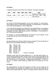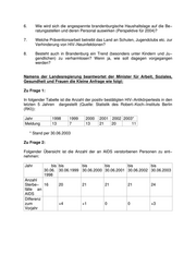 6. Wie wird sich die angespannte brandenburgische Haushaltslage auf die Be− ratungsstellen und deren Personal auswirken (Perspektive für 2004)? 7. Welche Präventionsarbeit betreibt das Land an Schulen, Jugendclubs etc. zur Verhinderung von HIV−Neuinfektionen? 8. Besteht auch in Brandenburg ein Trend (besonders unter Kindern und Ju− gendlichen) zu verharmlosen? Wenn ja, wie soll dagegen vorgegangen werden? Namens der Landesregierung beantwortet der Minister für Arbeit, Soziales, Gesundheit und Frauen die Kleine Anfrage wie folgt: Zu Frage 1: In folgender Tabelle ist die Anzahl der positiv bestätigten HIV−Antikörpertests in den letzten 5 Jahren dargestellt (Quelle: Statistik des Robert−Koch−Instituts Berlin (RKI)): Jahr 1998 1999 2000 2001 2002 2003* Meldung 13 7 13 21 20 11 * Stand per 30.06.2003 Zu Frage 2: Folgender Übersicht ist die Anzahl der an AIDS verstorbenen Personen zu ent− nehmen: Jahr bis bis bis bis bis bis 30.06. 30.06.1999 30.06.2000 30.06.2001 30.06.2002 30.06.2003 1998 Anzahl Sterbe− 16 20 21 21 21 24 fälle an AIDS Differenz zum +4 +1 0 0 +3 Vorjahr