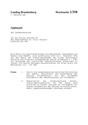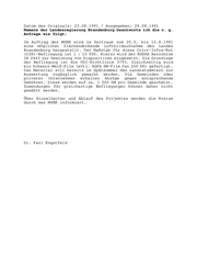 Datum des Originals: 23.08.1991 / Ausgegeben: 28.08.1991 Namens der Landesregierung Brandenburg beantworte ich die o. g. Anfrage wie folgt: Im Auftrag des MUNR wird im Zeitraum vom 20.5. bis 15.8.1991 eine möglichst flächendeckende Luftbildaufnahme des Landes Brandenburg hergestellt. Der Maßstab für diese Color-Infra-Rot (CIR)-Befliegung ist 1 : 10 000. Hierzu wird der KODAK Aerochrom IR 2443 zur Gewinnung von Diapositiven eingesetzt. Die Grundlage der Befliegung ist die VDI-Richtlinie 3793. Gleichzeitig wird ein Schwarz-Weiß-Film (evtl. AGFA SW-Film Pan 200 PE) gefertigt. Das Material soll bereits im Spätsommer den Landratsämtern zur Auswertung zugänglich gemacht werden. Die Gemeinden oder privaten Unternehmen erhalten Abzüge gegen entsprechende Gebühren. Diese werden auf ca. 1 000 DM pro Gemeinde geschätzt. Zuwendungen für gleichartige Befliegungen können daher nicht gewährt werden. Über Einzelheiten und Ablauf des Projektes werden die Kreise durch das MUNR informiert. Dr. Paul Engstfeld