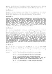 Landtag Brandenburg Drucksache 3/2000 3. Wahlperiode Antwort der Landesregierung auf die Kleine Anfrage 751 des Abgeordneten Werner Firneburg Fraktion der DVU Drucksache 3/1839 Täter-Opfer-Ausgleich Wortlaut der Kleinen Anfrage Nr. 751 vom 10. Oktober 2000: Ich frage die Landesregierung: 1. Wie viele Beratungsstellen zum Täter-Opfer-Ausgleich ar- beiten zurzeit im Land Brandenburg? 2. Wie hoch ist die Anzahl der Konfliktschlichtungen insge- samt? 3. In welchem Rahmen, in welcher Form und mit welchen Erfolgen wurden die durch Straftaten entstandenen Folgen aufgear- beitet und beigelegt? 4. Welche Rolle spielt hierbei die Wiedergutmachung der ent- standenen Schäden, auch der materiellen Schäden? 5. Welche Resozialisierungserfolge sind durch die Konflikt- schlichtung zu verzeichnen? 6. Wie erfolgt die Finanzierung dieser Beratungsstellen im Land Brandenburg? 7. Besteht die Gefahr, dass aufgrund von bestehenden Diffe- renzen zwischen Kommunen und freien Trägern Schlichtungs- stellen geschlossen werden müssen? Datum des Eingangs: 14.11.2000 / Ausgegeben: 20.11.2000