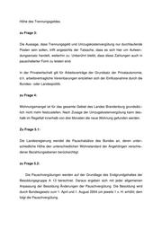 Höhe des Trennungsgeldes. zu Frage 3: Die Aussage, dass Trennungsgeld und Umzugskostenvergütung nur durchlaufende Posten sein sollen, trifft angesichts der Tatsache, dass es sich hier um Aufwen− dungsersatz handelt, weiterhin zu. Unberührt bleibt, dass diese Zahlungen auch in pauschalierter Form zu leisten sind. In der Privatwirtschaft gilt für Arbeitsverträge der Grundsatz der Privatautonomie, d.h. arbeitsvertragliche Vereinbarungen entziehen sich der Einflussnahme durch die Bundes− oder Landespolitik. zu Frage 4: Wohnungsmangel ist für das gesamte Gebiet des Landes Brandenburg grundsätz− lich nicht mehr festzustellen. Nach Zusage der Umzugskostenvergütung kann des− halb im Regelfall innerhalb von drei Monaten die neue Wohnung gefunden werden. Zu Frage 5.1: Die Landesregierung wendet die Pauschalsätze des Bundes an, deren unter− schiedliche Höhe den unterschiedlichen Wohnstandard der Angehörigen verschie− dener Bezahlungsebenen berücksichtigt. zu Frage 5.2: Die Pauschvergütungen werden auf der Grundlage des Endgrundgehaltes der Besoldungsgruppe A 13 berechnet. Daraus ergeben sich mit jeder allgemeinen Anpassung der Besoldung Änderungen der Pauschvergütung. Die Besoldung wird durch Bundesgesetz zum 1. April und 1. August 2004 um jeweils 1 v. H. erhöht; dem folgt die Pauschvergütung.