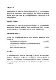 zu Frage 8.c): Das Ministerium des Innern, das Ministerium der Justiz und für Europaangelegen− heiten und das Ministerium für Bildung, Jugend und Sport haben in den vergange− nen drei Jahren ohne Zusage der Umzugskostenvergütung Trennungsgeld in 149 Fällen genehmigt. zu Frage 9.a) und b): Das Ministerium des Innern, das Ministerium der Justiz und für Europaangelegen− heiten und das Ministerium für Bildung, Jugend und Sport haben im Jahr 2002 keine Weiterbewilligungen für Trennungsgeld über drei Monate ausgesprochen. zu Frage 10.a), b) und c): Von den 2002 im Rahmen des Titels 453 in den Ministerien verausgabten Mitteln entfallen auf − Trennungsgeld bei Abordnungen 255.888 , − Trennungsgeld bei Zusage von Umzugskostenvergütungen 131.191 , − auf Umzugskostenvergütungen 129.235 . zu Frage 11: Im Haushaltsplan 2003 ist bei der Obergruppe 45 (Sonstige personalbezogene Ausgaben) insgesamt ein Betrag in Höhe von 6.325.200 veranschlagt, bei der Gruppe 453 (Trennungsgeld, Umzugskostenvergütung) hingegen ein Betrag in Höhe von 6.295.100 . Der Mittelabfluss in der Gruppe 453 betrug zum 30.09.2003 1.915.501,06 .