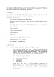 Fertigstellung laufender Verfahren. Es wurden 3 Teams gebildet (Grundstücksverkehr, ländliche Entwicklung, Bauwesen), die die Fertigstellung aller Verfahren sichern. Zu Frage 4: Im Rahmen von § 249h AFG Maßnahmen wurden zum 01.04.1996 56 Mitarbeitern Arbeitsverträge angeboten. Maßnahmeträger sind: - Wirtschaftsförderverein Neuruppin - Bildungs-Qualifizierung- und Strukturfördergesellschaft (BQSG) - Institut für kommunale Politikberatung und regionale Entwicklung - AFG Prenzlau - FIBAS/Finsterwalde - AQG Rathenow - GRW Teltow - Umweltforschung Großbeeren GmbH - Ingenieurbüro Dr. Eckhof - Büro Wenzel und Partner Zu Frage 5: 5.1. Werkverträge zu großen Bodenordnungsverfahren - Die Werkverträge zu den Bodenordnungsverfahren Ribbeck/Zabelsdorf und Groß Lüben, zu denen noch keine Einleitungsbeschlüsse ergangen waren, sind aufgehoben worden. Die Verfahren werden in eigener Verantwortung vom AfAO Neuruppin eingeleitet und bearbeitet. - Die Bodenordnungsverfahren . Lichtenberg/Karwe . Bensdorf . Saarmund . Neulewin sind auf der Basis entsprechender Verträge an Vermessungs- und andere Unternehmen übergeleitet. Diese Unternehmen sind durch das MELF als geeignete Stelle anerkannt und haben das Fachpersonal der BLG übernommen.