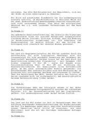 Landtag Brandenburg Drucksache 2/2677 2. Wahlperiode Antwort der Landesregierung auf die Kleine Anfrage 828 der Abgeordneten Christel Fiebiger Fraktion der PDS Drucksache 2/2515 Liquidation der Brandenburgischen Landgesellschaft Wortlaut der Kleinen Anfrage 828: Bei der weiteren Durchführung der Liquidation der BLG stehen u.a. Kündigungen, weitere Beschäftigungsmöglichkeiten und der Sozialplan, der mehrere Funktionen zu erfüllen hat, im Vordergrund der weiteren Umsetzung dieses Prozesses. Ich frage die Landesregierung: 1. Nach welcher Vorgehensweise wurden wieviel BLG-Mitarbeiter per 15.04.96 gekündigt? 2. Wieviele schwerbehinderte Mitarbeiter wurden gekündigt und gab es Fälle, bei denen die gesetzlichen Vorschriften gemäß Schwerbehindertengesetz nicht eingehalten wurden? 3. Mit welcher Begründung wurden Kündigungen ausgesprochen, die die Ferti g s t e l l u n g s o l cher Verfahren, wie Dorferneuerungsplanung, Flächennutzungsplanung und Bebauungsplanung stark beeinträchtigt? 4. Wieviel BLG-Mitarbeiter wurden nach § 249h AFG weiterbeschäftigt und wer sind die Projekt- und Maßnahmeträger? 5. Wie ist der Stand der Überleitung von großen Bodenordnungsverfahren und die Übernahme anderer bestehender Verträge?