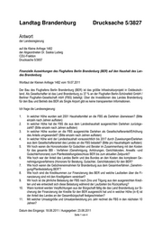 Landtag Brandenburg Drucksache 5/3827 Antwort der Landesregierung auf die Kleine Anfrage 1482 der Abgeordneten Dr. Saskia Ludwig CDU-Fraktion Drucksache 5/3657 Finanzielle Auswirkungen des Flughafens Berlin Brandenburg (BER) auf den Haushalt des Lan- des Brandenburg Wortlaut der Kleinen Anfrage 1482 vom 19.07.2011 Der Bau des Flughafens Berlin Brandenburg (BER) ist das größte Infrastrukturprojekt in Ostdeutsch - land. Als Gesellschafter ist das Land Brandenburg zu 37 % an der Flughafen Berlin-Schönefeld GmbH / Berliner Flughafen-Gesellschaft mbH (FBS) beteiligt. Über die Investitionen des Landes Brandenburg für den Bau und Betrieb des BER als Single Airport gibt es keine transparenten Informationen. Ich frage die Landesregierung: 1. In welcher Höhe wurden seit 2001 Haushaltsmittel an die FBS als Darlehen überwiesen? (Bitte einzeln nach Jahren auflisten) 2. In welcher Höhe hat die FBS die aus dem Landeshaushalt ausgereichten Darlehen zurückge- zahlt? (Bitte einzeln nach Jahren auflisten) 3. In welcher Höhe wurden an die FBS ausgereichte Darlehen als Gesellschafteranteil/Erhöhung des Anteils umgewandelt? (Bitte einzeln nach Jahren auflisten) 4. In welcher Höhe wird der Landeshaushalt voraussichtlich bis 2017 durch Zuweisungen/Darlehen aus dem Gesellschafteranteil des Landes an die FBS belastet? (Bitte pro Haushaltsjahr auflisten) 5. Wir hoch waren die Honorarkosten für Gutachten und Berater im Zusammenhang mit den Kosten für das gesamte BBI - Verfahren (Genehmigung, Anhörungen, Gerichtskosten, Anwalts –und Gutachterhonorare) zum Planfeststellungsbeschluss BER bis zum aktuellen Zeitpunkt? 6. Wie hoch war der Anteil des Landes Berlin und des Bundes an den Kosten des komplexen Ge - nehmigungsverfahrens (Honorare für Beratung, Gutachter, Gerichtskosten) für den BER? 7. Wie hoch waren die Gebühreneinnahmen für Brandenburg aus dem Gesamtverfahren „Genehmi- gung/Planfeststellung BER“? 8. Wie hoch sind die Kreditsummen zur Finanzierung des BER und welche Laufzeiten über die Fi- nanzierung sind mit den Kreditgebern vereinbart? 9. Wir hoch ist die jährliche Belastung der FBS nach Zins und Tilgung aus den ausgereichten Kredi- ten und wie entwickelt sich diese Belastung während der Laufzeiten bis Rückzahlung? 10. Wann konkret werden Verpflichtungen aus der Bürgschaft fällig die das Land Brandenburg zur Si- cherung der Finanzierung der Kredite für den BER ausgereicht hat und in welcher Höhe (in €) ist der Anteil des Landes an der Gesamtbürgschaft festgeschrieben? 11. Mit welcher Umsatzgröße und Umsatzentwicklung pro Jahr rechnet die FBS in den nächsten 10 Jahren? Datum des Eingangs: 18.08.2011 / Ausgegeben: 23.08.2011 Seite 1 von 4