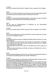 12. Zu welchem Zeitpunkt rechnet die Landesregierung mit einem „Return of Investment“ durch Steuereinnahmen (Gewerbesteuern, Einkommenssteueranteile) aus der Geschäftstätigkeit des BER und von Unternehmen die der Geschäftstätigkeit des BER zugerechnet werden können? 13. In welcher Höhe belaufen sich die Kostenanteile des Landes Brandenburg an der Sicherstellung der Infrastruktur (z. B. Straßenanbindung) für den BER? Namens der Landesregierung beantwortet der Minister der Finanzen die Kleine Anfrage wie folgt: Frage 1: In welcher Höhe wurden seit 2001 Haushaltsmittel an die FBS als Darlehen überwiesen? (Bitte einzeln nach Jahren auflisten) Frage 2: In welcher Höhe hat die FBS die aus dem Landeshaushalt ausgereichten Darlehen zurückgezahlt? (Bit- te einzeln nach Jahren auflisten) Frage 3: In welcher Höhe wurden an die FBS ausgereichte Darlehen als Gesellschafteranteil/Erhöhung des An - teils umgewandelt? (Bitte einzeln nach Jahren auflisten) zu den Fragen 1 bis 3: Im Haushaltsplan des Landes Brandenburg waren in den Haushaltsjahren ab 2001 folgende Darlehen an die Berlin Brandenburg Flughafen Holding (BBF) und die Flughafen Berlin-Schönefeld GmbH (FBS) veranschlagt: davon Haus- Darlehensbe- Darlehen halts-jahr trag - umgewandelt in Eigenkapital der FBS - Frage 4: in Mio. EUR In welcher Höhe wird der Landes- 2001 6,60 6,60 haushalt voraussichtlich bis 2017 2002 1,40 1,40 durch Zuweisungen/Darlehen aus dem Gesellschafteranteil des Lan- 2003 1,30 1,30 des an die FBS belastet? (Bitte pro 2004 35,50 35,50 Haushaltsjahr auflisten) 2005 0 - 2006 0 - zu Frage 4: 2007 0 - Für die Jahre nach 2010 sind keine Zuweisungen oder Darlehen des 2008 0 - Gesellschafters Land Brandenburg 2009 0 - an die FBS vorgesehen. 2010 0 - Frage 5: Wie hoch waren die Honorarkosten für Gutachten und Berater im Zusammenhang mit den Kosten für das gesamte BBI - Verfahren (Geneh- migung, Anhörungen, Gerichtskosten, Anwalts –und Gutachterhonorare) zum Planfeststellungsbe- schluss BER bis zum aktuellen Zeitpunkt? Seite 2 von 4