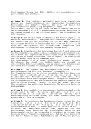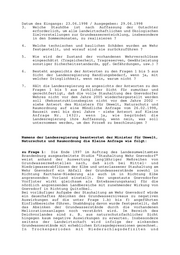 Landtag Brandenburg Drucksache 2/5434 2. Wahlperiode Antwort der Landesregierung auf die Kleine Anfrage Nr. 1701 des Abgeordneten Rainer Neumann Fraktion der CDU, Drucksache 2/5303 Gnevsdorfer Wehr Wortlaut der Kleinen Anfrage Nr. 1701: In der Antwort auf die Kleine Anfrage 1432 erklärte die Landesregierung, daß die Auswirkungen eines eingeschränkten Betriebes oder der völligen Einstellung des Betriebes des Gnevsdorfer Wehres erst nach Vorliegen eines Gutachtens über die gegenwärtigen und künftigen Bedarfsansprüche analysiert und beurteilt werden können. Nach Aussage des Ministers für Umwelt, Naturschutz und Raumordnung liegt dieses Gutachten inzwischen vor. Ich frage die Landesregierung: 1. Welche Auswirkungen auf a) die Grundwasserentwicklung, b) die Realisierung der landwirtschaftlichen Zielvorstellungen, c) den Fortbestand der vorhandenen Biotopstrukturen, d) den Fortbestand der vorhandenen natürlichen Auwaldreste (z. B. "Lennewitzer Eichen"), e) das EU-Life-Projekt "Auenrenaturierung, Teilprojekt Gnevsdorfer Werder", f) das Nahrungsaufkommen der Weißstörche, hätte nach Auffassung der Gutachter eine völlige Aufgabe der Stauhaltung des Gnevsdorfer Wehres, insbesondere in Trockenperioden mit Niederschlagsdefiziten? 2. Welche Auswirkungen wären nach Auffassung der Gutachter zu erwarten, wenn das Wehr mit einer reduzierten Stauhaltung weiterbetrieben werden würde, untergliedert von a) bis f) (siehe Frage 1) ?