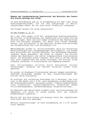 Landtag Brandenburg - 2. Wahlperiode Drucksache 2/1016 Namens der Landesregierung beantwortet der Minister des Innern die Kleine Anfrage wie folgt: Im Land Brandenburg gab es im Zusammenhang mit dem 1.Mai keine Auseinandersetzungen, die mit den Ereignissen in Berlin vergleichbar wären. Es ist auch keine "Tradition" erkennbar. Die Fragen werden wie folgt beantwortet: Zu den Fragen 1, 2, 3: Am 1. Mai 1995, gegen 19.00 Uhr, beobachteten Aufklärungskräfte der Polizei in Finsterwalde, wie Jugendliche sich trafen und zum Zentrum zogen. Nach und nach kamen im Bereich des Marktplatzes etwa 120 Personen zusammen, von denen sich einige vermummt hatten. Sie errichteten in der Berliner Straße eine Barrikade aus mitgebrachtem Holz und entzündeten sie. Währenddessen wurden ca. 80 Polizeibeamte (auch ein Einsatzzug Bereitschaftspolizei) zusammengezogen und eingesetzt. Sie wurden beim Eintreffen mit Steinen beworfen, die anrückende Feuerwehr zunächst daran gehindert, das Feuer zu löschen. Die Polizei räumte den Marktplatz und setzte ausgesprochene Platzverweise durch. Die Feuerwehr konnte löschen. Kurz nach 21.00 Uhr hatten fast alle Jugendlichen die Stadt verlassen. Die Polizei blieb zunächst verstärkt in Finsterwalde und Umgebung präsent. Zwei Polizeibeamte erlitten durch Steinwürfe leichte Verletzungen. Hinweise auf weitere Verletzte wurden nicht gewonnen. Es wurden im Stadtpark Finsterwalde mehrere Lampen beschädigt, außerdem entstanden Schäden an drei Einsatzfahrzeugen der Polizei durch Steinwürfe. Es erfolgte die vorläufige Festnahme von 6 Personen, die alle noch in der Nacht zum 2.5.95, nach Vernehmung in Abstimmung mit der Staatsanwaltschaft, entlassen wurden. 9 Ermittlungsverfahren sind eingeleitet (Landfriedensbruch, Widerstand gegen Vollstreckungsbeamte, Sachbeschädigung, Körperverletzung). Die Mehrzahl der Beteiligten stammte nicht aus Finsterwalde und Umgebung, sie waren zu einem großen Teil aus anderen Bundesländern angereist. Motive für die Aktivitäten und etwaige Ziele der Jugendlichen sind nicht deutlich geworden. Weitere Ausschreitungen im Land Brandenburg am 1.5.95 wurden nicht bekannt. 2