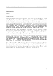Landtag Brandenburg - 2. Wahlperiode Drucksache 2/1016 Zu Frage 4: Nein. Zu Frage 5: Um entsprechende Ausschreitungen möglichst zu verhindern, wird die Polizei eingesetzt. Dazu werden den Polizeibehörden zu tatkritischen Zeiten zur Erhöhung der Präsenz unter anderem Kräfte der Bereitschaftspolizei unterstellt und auf Landesebene Reserven vorgehalten. Sie stehen auch für die möglichst schnelle Beendigung entsprechender Störungen der öffentlichen Sicherheit und Ordnung zur Verfügung. Erforderliche Kräftezuweisungen darüber hinaus -auch unter Einbeziehung von Unterstützungen aus anderen Bundesländern- erfolgen nach der jeweiligen Lage. Im Hinblick auf die besonderen Probleme bei der polizeilichen Aufgabenwahrnehmung in diesem Zusammenhang werden die Führungs- und Einsatzkräfte in speziellen Aus- und Fortbildungsmaßnahmen, auch durch praxisbezogene Übungen, gezielt vorbereitet. Soweit sich auf örtlicher Ebene entsprechende Lageentwicklungen andeuten, strebt die Polizei unabhängig von ihren Einsatzmaßnahmen die Zusammenarbeit mit Kommunen und Landkreisen im Rahmen der "Kommunalen Kriminalitätsverhütung (KKV)" an. Absicht ist, ressortübergreifende Vorbeugungsstrategien gemeinsam zu entwickeln und umzusetzen. Mit polizeilichen Maßnahmen sind zwar unmittelbar bevorstehende Auseinandersetzungen zu verhindern oder Gewalttätigkeiten zu beenden, die Ursachen von Gewalt jedoch nur begrenzt zu beeinflussen. Die Landesregierung unterstützt daher aktiv alle Bemühungen zur Eindämmung der Ursachen von Gewalt. 3