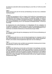 2 Namens der Landesregierung beantwortet die Ministerin für Umwelt, Gesundheit und Verbraucher- schutz die Kleine Anfrage wie folgt: Vorbemerkung: Die Abrechnung der Laborleistungen auf die beiden Trägerländer erfolgt mittels einer Kosten- und Leistungsrechnung (KLR), in die Daten eines einheitlichen Laborinformationssystems eingehen sollen. Dieses einheitliche Laborinformationssystem konnte bisher noch nicht etabliert werden, so dass eine Bewertung der einzelnen Leistungen nicht in allen Details möglich ist. Deshalb prüfen die Fachverwaltungen der beiden Länder gemeinsam mit dem Landeslabor eine Möglichkeit der Leistungszuordnung und damit auch der Kostenzuordnung auf beide Länder anhand der derzeit von der KLR des Landeslabors bereitgestellten Daten. Voraussetzung für eine abschließende Bewertung ist jedoch ein geprüfter und testierter Jahresabschluss des Landeslabors. Dieser liegt derzeit für 2010 noch nicht vor. Nach dem Sitzlandprinzip gilt für das Landeslabor das Recht des Landes Berlin, danach wird der Wirtschaftsprüfer durch den Landesrechnungshof Berlin beauftragt. Nach derzeit vorliegenden Informationen ist das Ausschreibungsverfahren für die Beauftragung des Wirtschaftsprüfers noch nicht abgeschlossen. Frage 1: Wie hoch waren im Jahr 2010 die auf das Land Berlin entfallenen Leistungen? Frage 2: Wie hoch waren im Jahr 2010 die auf das Land Brandenburg entfallenen Leistungen? zu den Fragen 1 und 2: Die Untersuchungsbereiche, in denen das Landeslabor Berlin-Brandenburg für die Länder Berlin und Brandenburg Leistungen erbringt, sind in der Anlage aufgeführt. Aufgrund unterschiedlicher Leistungsbereiche, teilweise unterschiedlicher Untersuchungsumfänge in den einzelnen Leistungsbereichen sowie des bisher noch fehlenden einheitlichen Laborinformationssys - tems ist ein direkter Vergleich der Leistungen für die beiden Länder derzeit noch nicht möglich. Frage 3: Wie hoch waren im Jahr 2010 die jeweiligen Zahlungen von Berlin und Brandenburg für das gemeinsa - me Landeslabor? zu Frage 3: Der Zuschuss des Landes Berlin betrug im Jahre 2010 19.200.000 Euro. Der Zuschuss des Landes Brandenburg betrug 19.258.700 Euro. Zusätzlich wurden für Sonderleistun- gen, die nicht in der Leistungsvereinbarung enthalten waren, 264.000 Euro gezahlt. Frage 4: Welchen Zuschuss für das Jahr 2012 wird das Land Brandenburg in der nach § 9 (2) zu schließenden Vereinbarung zahlen? zu Frage 4: Aufgrund der Doppelung der Fragen 4 und 5 wird davon ausgegangen, dass mit dieser Frage die Zah - lungen des Landes Berlin gemeint sind. Entsprechend dem Wirtschaftsplan für das Jahr 2012 wird die voraussichtliche Zahlung des Landes Berlin 17,2 Mio. Euro betragen. In Abhängigkeit von dem Ergebnis der Jahresabrechnung 2010 haben