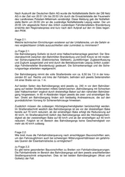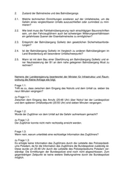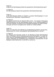 2. Zustand der Bahnstrecke und des Bahnübergangs 2.1. Welche technischen Einrichtungen existieren auf der Unfallstrecke, um die Gefahr eines vergleichbaren Unfalls auszuschließen oder zumindest zu mini- mieren? 2.2. Wie breit muss die Fahrbahnüberquerung nach einschlägigen Bauvorschriften sein, um den Fahrzeugführern auch bei schwierigen Witterungsverhältnissen ein gefahrloses Queren der Eisenbahnstrecke zu ermöglichen? 2.3. Entspricht der Bahnübergang Gollwitz den gesetzlichen Sicherheitsanforde- rungen? 2.4. Ist der Bahnübergang Gollwitz im Vergleich zu anderen Bahnübergängen im Land Brandenburg ein besonderer Unfallschwerpunkt? 2.5. Wann ist mit dem Bau einer Überführung am Bahnübergang Gollwitz und ei- ner Neutrassierung der B1 an dem nahe gelegenen Bahnübergang Wust zu rechnen? Namens der Landesregierung beantwortet der Minister für Infrastruktur und Raum- ordnung die Kleine Anfrage wie folgt: Frage 1.1: Trifft es zu, dass zwischen dem Eingang des Notrufs und dem Unfall ca. sieben bis neun Minuten vergingen? zu Frage 1.1: Zwischen dem Eingang des Anrufs (20:48 Uhr) über Notruf bei der Landespolizei und dem späteren Unfallzeitpunkt (20:55 Uhr) sind sieben Minuten vergangen. Frage 1.2: Wurde der Zugführer vor dem Unfall auf die Gefahr aufmerksam gemacht? zu Frage 1.2: Der Zugführer konnte nicht mehr rechtzeitig erreicht werden. Frage 1.3: Wenn nein, warum unterblieb eine rechtzeitige Information des Zugführers? zu Frage 1.3: Es erfolgte keine Information des Zugführers durch die Leitstelle des Polizeipräsidi- ums Potsdam, da für die Information des Zugführers die Bundespolizei zuständig ist. Diese wurde um 20:49 Uhr durch die Leitstelle des Polizeipräsidiums Potsdam ver- ständigt. Die Ermittlungen der Bundespolizei sind noch nicht abgeschlossen. Zum gegenwärtigen Zeitpunkt ist keine weitere Stellungnahme durch die Bundespolizei möglich.