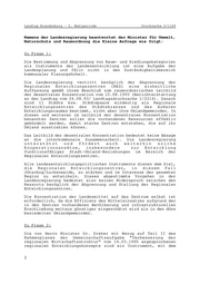 Landtag Brandenburg Drucksache 2/1169 2. Wahlperiode Antwort der Landesregierung auf die Kleine Anfrage 273 des Abgeordneten Dierk Homeyer Fraktion der CDU Drucksache 2/853 Regionale Entwicklungszentren Wortlaut der Kleinen Anfrage 273 vom 02.06.1995: Am 24.05.1995 forderte der Minister für Wirtschaft, Mittelstand und Technologie auf einer Beratung mit dem Unternehmerverband Teltow-Fläming die Kommunen auf, regionale Entwicklungskonzepte zu entwickeln. Dieses sei ein unschätzbarer Vorteil, da damit Fördermittel aus verschiedenen Ministerien gebündelt werden könnten. Seit zwei Jahren besteht ein Konzept des Regionalen Entwicklungszentrums (REZ) Jüterbog, Luckenwalde, Amt Niedergörsdorf und der Gemeinde Nuthe-Urstromtal. Diese Kommunen erarbeiten als Planungsgemeinschaft das o.g. Konzept, während das MUNR ausschließlich die Städte Jüterbog und Luckenwalde als Entwicklungszentrum betrachtet. Ich frage daher die Landesregierung: 1. Wie ist der geschilderte Widerspruch zwischen den Fachressorts zu erklären? 2. Wie werden die vom Minister Dr. Dreher angesprochenen regionalen Entwicklungskonzepte in der Landesplanung berücksichtigt? 3. Welche Möglichkeiten der Förderung von REZ bestehen nach dem 24. Rahmenplan GA, Teil III? 4. Wie steht die Landesregierung zur Entwicklung von Wirtschaftsregionen an zu entwickelnden Orten nach dem Leitbild der dezentralen Konzentration? Datum des Eingangs: 02.08.1995 / Ausgegeben: 08.08.1995