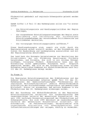 Landtag Brandenburg - 2. Wahlperiode Drucksache 2/1169 Fördermittel gebündelt auf regionale Schwerpunkte gelenkt werden sollen. Gemäß Ziffer 1.6 Teil II des Rahmenplanes sollen sie "in erster Linie - die Entwicklungsziele und Handlungsprioritäten der Region festlegen, - die vorgesehenen Entwicklungsanstrengungen der Region sowie Abstimmung und Verzahnung der notwendigen Entwicklungsmaßnahmen der verschiedenen Politikbereiche und Politikebenen darstellen, - die vorrangigen Entwicklungsprojekte aufführen." Diese Handlungskonzepte sind, soweit sie nicht durch die Regionalplanung selbst erstellt werden, an den Grundsätzen und Zielen von Raumordnung und Landesplanung auszurichten und mit der Regionalplanung abzustimmen. Das Land kann die Konzepte beispielsweise zur Beurteilung der Dringlichkeit der zur Förderung beantragten Projekte heranziehen, und Projekte, die sich in ein solches Konzept einfügen, vorrangig fördern. Andererseits kann aus der Erarbeitung eines gemeinsamen Konzeptes kein Anspruch abgeleitet werden, daß alle an der Erarbeitung eines solchen Konzeptes beteiligten Kommunen mit Höchstfördersätzen nach Teil III des 24. Rahmenplanes belegt werden. Zu Frage 3: Die Regionalen Entwicklungszentren des Städtekranzes und des äußeren Entwicklungsraumes erhalten gemäß Teil III des 24. Rahmenplanes der Gemeinschaftsaufgabe "Verbesserung der regionalen Wirtschaftsstruktur" jeweils Höchstfördersätze hinsichtlich der wirtschaftsnahen Infrastruktur und gewerblichen Wirtschaft. Hierzu ist anzumerken, daß weitere Kommunen in die Förderkulisse des 24. Rahmenplanes einbezogen wurden. Mit der Zuordnung von Höchstfördersätzen zu den Regionalen Entwicklungszentren entspricht die Landesregierung dem raumordnerischen Leitbild der dezentralen Konzentration. Der seit 1991 verfolgte Konzentrationsprozeß der Förderkulisse auf Schwerpunktorte, die sich 1995 dezidiert am raumordnerischen Leitbild der dezentralen Konzentration orientiert, war erforderlich, um Fehlentwicklungen, beispielsweise eine ungenügende Auslastung von Gewerbegebieten und Infrastruktureinrichtungen und -anlagen, künftig zu vermeiden. 3