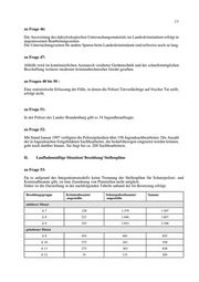 26 zu Frage 46: Die Auswertung des daktyloskopischen Untersuchungsmaterials im Landeskriminalamt erfolgt in angemessenen Bearbeitungszeiten. Die Untersuchungszeiten für andere Spuren beim Landeskriminalamt sind teilweise noch zu lang. zu Frage 47: Abhilfe wird im kontinuierlichen Austausch veralteter Gerätetechnik und der schnellstmöglichen Beschaffung weiterer moderner kriminaltechnischer Geräte gesehen. zu Fragen 48 bis 50 : Eine statististische Erfassung der Fälle, in denen die Polizei Tatverdächtige auf frischer Tat stellt, erfolgt nicht. zu Frage 51: In der Polizei des Landes Brandenburg gibt es 34 Jugendbeauftragte. zu Frage 52: Mit Stand Januar 1997 verfügten die Polizeipräsidien über 158 Jugendsachbearbeiter. Die Anzahl der in Jugendsachen fortgebildeten Sachbearbeiter, die bedarfsbezogen eingesetzt werden können, geht noch darüber hinaus. Sie liegt bei ca. 200 Sachbearbeitern. II. Laufbahnmäßige Situation/ Besoldung/ Stellenpläne zu Frage 53: Da es aufgrund des Integrationsmodells keine Trennung der Stellenpläne für Schutzpolizei- und Kriminalbeamte gibt, ist eine Zuordnung von Planstellen nicht möglich. Daher ist die Darstellung in der nachfolgenden Tabelle anhand der Ist-Besetzung erfolgt: Besoldungsgruppe Kriminalbeamte/ Schutzpolizeibeamte/ Summe -angestellte -angestellte mittlerer Dienst A7 128 1.379 1.507 A8 221 1.446 1.667 A9 255 1.933 2.188 gehobener Dienst A9 454 401 855 A 10 275 283 558 A 11 275 363 638 A 12 74 131 205