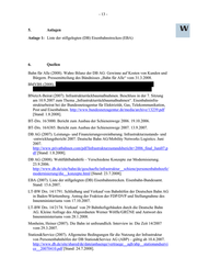 - 13 - 5. Anlagen Anlage 1: Liste der stillgelegten (DB) Eisenbahnstrecken (EBA) 6. Quellen Bahn für Alle (2008). Wahre Bilanz der DB AG: Gewinne auf Kosten von Kunden und Bürgern. Pressemitteilung des Bündnisses „Bahn für Alle“ vom 31.3.2008. BMVBS (2008). BNetzA-Beirat (2007). Infrastrukturrückbaumaßnahmen. Beschluss in der 7. Sitzung am 10.9.2007 zum Thema „Infrastrukturrückbaumaßnahmen“. Eisenbahninfra- strukturbeirat bei der Bundesnetzagentur für Elektrizität, Gas, Telekommunikation, Post und Eisenbahnen. http://www.bundesnetzagentur.de/media/archive/13239.pdf [Stand: 1.8.2008]. BT-Drs. 16/3000. Bericht zum Ausbau der Schienenwege 2006. 19.10.2006. BT-Drs. 16/6385. Bericht zum Ausbau der Schienenwege 2007. 13.9.2007. DB AG (2007). Leistungs- und Finanzierungsvereinbarung. Infrastrukturzustands- und -entwicklungsbericht 2007. Deutsche Bahn AG/Mobility Networks Logistics. Juni 2007. http://www.privatbahnen.com/pdf/Infrastrukturzustandsbericht+2006_final_Juni07.p df [Stand: 1.8.2008]. DB AG (2008). Wohlfühlbahnhöfe – Verschiedene Konzepte zur Modernisierung. 23.9.2006. http://www.db.de/site/bahn/de/geschaefte/infrastruktur__schiene/personenbahnhoefe/ modernisierung/die__konzepte.html [Stand: 23.7.2008]. EBA (2007). Liste der stillgelegten (DB) Eisenbahnstrecken. Eisenbahn-Bundesamt. Stand: 15.6.2007. LT-BW Drs. 14/1791. Schließung und Verkauf von Bahnhöfen der Deutschen Bahn AG in Baden-Württemberg. Antrag der Fraktion der FDP/DVP und Stellungnahme des Innenministeriums vom 17.10.2007. LT-BW Drs. 14/2174. Verkauf von 29 Bahnhofsgebäuden durch die Deutsche Bahn AG. Kleine Anfrage des Abgeordneten Werner Wölfle/GRÜNE und Antwort des Innenministeriums vom 28.1.2008. Monheim, Heiner (2007). Die Bahn ist unfreundlich. Interview in: Die Zeit 14/2007 vom 29.3.2007. Station&Service (2007). Allgemeine Bedingungen für die Nutzung der Infrastruktur von Personenbahnhöfen der DB Station&Service AG (ABP) – gültig ab 10.4.2007. http://www.db.de/site/shared/de/dateianhaenge/vertraege__agb/abp__stationundservi ce__20070410.pdf [Stand: 24.7.2008].