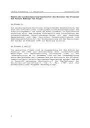Landtag Brandenburg - 2. Wahlperiode Drucksache 2/160 Namens der Landesregierung beantwortet der Minister der Finanzen die Kleine Anfrage wie folgt: zu Frage 1: Die Landesregierung wird einen entsprechenden Gesetzentwurf, der auch die erforderlichen zusätzlichen Einstufungsregelungen für Schulleitungsämter und sonstige Funktionsämter im Schulbereich enthalten wird, dem Landtag rechtzeitig nach Durchführung der vorgeschriebenen Beteiligungsverfahren mit dem Deutschen Beamtenbund und dem Deutschen Gewerkschaftsbund und Abstimmungsverfahren mit der Bundesregierung und den Regierungen der Länder im Frühjahr 1995 zur Beratung zuleiten. zu Fragen 2 und 3: Die gestellten Fragen sind im Zusammenhang mit dem Antrag der Fraktion der PDS auf Entscheidung über landesrechtliche Regelungen zur Lehrerbesoldung (Drucksache 2/48) in der Landtagssitzung am 18. November 1994 von der Landesregierung durch den Minister der Finanzen und die Ministerin für Bildung, Jugend und Sport bereits dahingehend beantwortet worden, daß der in Aussicht genommene Gesetzentwurf den Empfehlungen der Kultusministerkonferenz vom 7. Mai 1993 und den bundesrechtlichen Vorgaben Rechnung trägt. 2