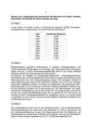 Landtag Brandenburg Drucksache 4/434 4. Wahlperiode Antwort der Landesregierung auf die Kleine Anfrage Nr. 112 der Abgeordneten Roswitha Schier Fraktion der CDU Landtagsdrucksache 4/256 Demografische Entwicklung und Schwangerschaftsabbrüche Wortlaut der Kleinen Anfrage Nr. 112 vom 09.12.2004: Die demografische Entwicklung in der Bundesrepublik Deutschland und die damit verbundenen Probleme stellen uns vor große Herausforderungen. Darüber wird zurzeit heftig diskutiert. Deutschland hat die weltweit höchste Zahl an Kinderlosen. Es gelingt immer weniger, junge Menschen für ein Leben mit Kindern zu begeistern. Bei ungewollter Schwangerschaft wird oft gegen das Kind und für die Abtreibung entschieden, weil wir es nicht schaffen, Perspektiven aufzuzeigen, der werdenden Mutter Mut zu machen und ihr die notwendige Unterstützung zu gewähren. Ich frage die Landesregierung: 1. Wie viele Schwangerschaftsabbrüche wurden in Brandenburg in den letzten 10 Jahren jährlich vorgenommen? 2. Gibt es Erkenntnisse, in welchen Lebenssituationen sich Frauen besonders häufig gegen das Kind entschieden haben? 3. Was unternimmt die Landesregierung, um die Bedingungen zu verbessern, damit sich zunehmend mehr junge Menschen für Kinder entscheiden? Datum des Eingangs: 12.01.2005 / Ausgegeben: 17.01.2005