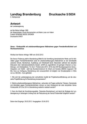 Landtag Brandenburg Drucksache 5/5034 5. Wahlperiode Antwort der Landesregierung auf die Kleine Anfrage 1889 der Abgeordneten Ursula Nonnemacher und Marie Luise von Halem Fraktion BÜNDNIS 90/DIE GRÜNEN Drucksache 5/4831 Xenos - Förderpolitik mit arbeitsmarktbezogenen Maßnahmen gegen Fremdenfeindlichkeit und Rechtsextremismus Wortlaut der Kleinen Anfrage 1889 vom 28.02.2012: Die Xenos–Förderung stellt in Brandenburg Mittel für die Vermittlung demokratischer Werte und für Akti - vitäten gegen Fremdenfeindlichkeit sowie für arbeitsmarktbezogene Maßnahmen an der Schnittstelle zwischen Schule, Berufschule, Ausbildung und Arbeitswelt bereit. Besonders während der aktuellen Diskussion über nationalsozialistische Gewalt, verhilft sie Jugendlichen mit geringen Chancen zu Aus - bildungs- und Arbeitsplätzen. Für die 2. Förderrunde (2012 -2014) des ESF-Bundesprogramms Xenos - Integration und Vielfalt - stellt das Bundesministerium für Arbeit und Soziales (BMAS) insgesamt 100 Mio. Euro zur Verfügung. Brandenburg wird voraussichtlich mit lediglich vier Einzelprojekten in Höhe von ca. 900.000,-- Euro gefördert. 1. Wie wird die Landesregierung den vermutlichen Ausfall der Projektverbundförderung und die redu - zierte Projektförderung für Brandenburg kompensieren? 2. Welche arbeitsmarktbezogenen Maßnahmen, verbunden mit Fragen politischer Toleranz, Demokratie und Aktivitäten gegen Fremdenfeindlichkeit, können vor dem Hintergrund der oben skizzierten Xenos Förderpolitik 2012 bis 2014 in Brandenburg weiterhin realisiert werden? 3. Kann die Arbeit der Koordinierungsstelle „Tolerantes Brandenburg“ und damit die Strategie der Lan - desregierung in bisherigem Umfang trotz der Reduzierung der Xenos-Fördermittel fortgeführt werden? Datum des Eingangs: 29.03.2012 / Ausgegeben: 03.04.2012