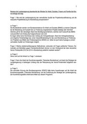 2 Namens der Landesregierung beantwortet der Minister für Arbeit, Soziales, Frauen und Familie die Klei - ne Anfrage wie folgt: Frage 1: Wie wird die Landesregierung den vermutlichen Ausfall der Projektverbundförderung und die reduzierte Projektförderung für Brandenburg kompensieren? zu Frage 1: Die Bundesländer werden vom Bundesministerium für Arbeit und Soziales (BMAS) zu keinem Zeitpunkt bei der Bewertung und Auswahl der zur Förderung vorgesehenen Projekte beteiligt oder informiert. Gleiches gilt für den derzeitigen Stand des Bewilligungsverfahrens, welches nach Auskunft des BMAS voraussichtlich erst Anfang April abgeschlossen sein wird. Es liegen daher keine Kenntnisse über Umfang der Antragstellungen, Stand der Antragsbearbeitung und mögliche Förderbeträge bzw. einen Gesamtförderbetrag für das Land Brandenburg zur Förderung von Projekten aus Mitteln des Förderprogramms XENOS vor. Daher ist auch keine Aussage zu einem vermuteten Ausfall von Förderungen möglich. Frage 2: Welche arbeitsmarktbezogenen Maßnahmen, verbunden mit Fragen politischer Toleranz, De- mokratie und Aktivitäten gegen Fremdenfeindlichkeit, können vor dem Hintergrund der oben skizzierten Xenos Förderpolitik 2012 bis 2014 in Brandenburg weiterhin realisiert werden? zu Frage 2: Hierzu wird auf die Antwort zu Frage 1 verwiesen. Frage 3: Kann die Arbeit der Koordinierungsstelle „Tolerantes Brandenburg“ und damit die Strategie der Landesregierung in bisherigem Umfang trotz der Reduzierung der Xenos-Fördermittel fortgeführt wer- den? zu Frage 3: Die vermutete Kürzung des Bundesprogramms XENOS hätte keine Auswirkungen auf die Arbeit der Koordinierungsstelle „Tolerantes Brandenburg“ und die Fortführung der Strategie der Landesregierung. Die Koordinierungsstelle erhält keine Mittel aus diesem Programm.