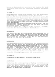 Namens s der Landesregierung beantwortet der Minister für Land- - wirtschaft, Umweltschutz und Raumordnung g die Kleine Anfrage wie folgt: Zu Frage 1: Die Vorkehrungen bezogen sich in erster Linie auf den Transport von Klauentieren und Veranstaltungen mit Klauentieren. Nach dem MKS-Ausbruch im Vereinigten Königreich wurden alle Veranstaltungen mit Klauentieren, wie Auktionen und Ausstellun- gen verboten. Transporte von Klauentieren wurden nur in bestimm- ten Fällen mit amtstierärztlicher Ausnahmegenehmigung ermög- licht. Pferdeveranstaltungen unterlagen strengen seuchenhygieni- schen Bestimmungen. Das Verbringen von Wanderschafherden wurde untersagt, wie auch das Verbringen lebender Klauentiere und von deren Fleisch aus betroffenen Ländern oder Regionen . Die Veterinärämter der Landkreise wurden angewiesen, verstärkte Kontrollen des Tierseuchenschutzes durchzuführen. Zu Frage 2: Eine durch das Land zu finanzierende Notfallmaßnahme ist im Falle eines MKS-Ausbruches die Bereitstellung des Impfstoffes, wenn eine Not- oder Ringimpfung erforderlich wird. Für die Vor- rätighaltung des Impfstoffes werden für die MKS-Vakzinebank jährlich rund 640.000,- DM eingesetzt. Zu Frage 3: Die Landesregierung steht zum Beschluss der Agrarministerkon- ferenz, die MKS-Impfung als Notimpfung bei einem MKS-Ausbruch als konkrete Bekämpfungsmaßnahmen einzusetzen. Sie ist bereit, sich dafür einzusetzen, dass bei bekanntem Virustyp in begrenz- tem Umfang in gefährdeten Gebieten sowie auch zum Schutz selte- ner Rassen und der Zootiere die Impfung eingesetzt werden kann, sofern schwerwiegende Sanktionen für geimpfte Tiere und deren Produkte vermieden werden können. Die Wiedereinführung einer generellen Schutzimpfung gegen die MKS ist abzulehnen. Zu Frage 4: Ein markierter MKS-Impfstoff existiert bisher nicht. Zu Frage 5: Die Haltung der Landesregierung zur Impfung von Zootieren und gefährdeten Klauentierrassen ist unter Pkt. 3 bereits dargelegt worden. Bei akuter Gefährdung macht die Impfung dieser Tiere Sinn. Impfungen gegen MKS wurden aber im laufenden Jahr in kei- nem Fall in Deutschland durchgeführt.