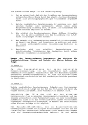 Landtag Brandenburg Drucksache 2/1579 2. Wahlperiode Antwort der Landesregierung auf die Kleine Anfrage Nr. 436 des Abgeordneten Christoph Schulze, Fraktion der SPD, Landtagsdrucksache 2/1237 Wortlaut der Kleinen Anfrage Nr. 436 vom 23.08.1995 Baugenehmigungen Schon in den Jahren 1993 und 1994 schäftigte sich der Petitionsausschuß des Landtages Brandenburg mit in mehreren Fällen mit Problemen privater Bauherrn, so war z.B. ein Ehepaar 1991 Eigentümer eines Grundstücks am Waldrand in Groß Glienicke geworden. Im Sie stellten einen Bauantrag, weiterhin hatten sie im August 1992 vom Amtsdirektor die Erlaubnis erhalten, 16 Bäume auf ihrem Grundstück zu entfernen. Im Dezember 1992 folgte die Baugenehmigung für ihr Einfamilienhaus. Erst als die Genehmigung für die Errichtung einer Ölheizung beantragt wurde, teilte man den Eheleuten, mit einer Untersagung (Verbot) mit, zunächst sei eine forstrechtliche Umwandlungsgenehmigung zur Änderung der Wald-Nutzung in eine Wohn-Nutzung erforderlich. Vor dem Verwaltungsgericht Postdam unterlag die Familie mit ihrem Verweis auf die schon erteilte Baugenehmigung. Im Vertrauen auf die Gültigkeit und die Kontaktionswirkung (Freistellung) der staatlichen Entscheidung (Baugenehmigung entsprechend BauO durch staatl. Bauordnungsbehörde der Kreisverwaltung) hatte die Famile auch schon erhebliche Schulden aufgenommen. (Quelle u.a. MAZ 23.12.1994 und Fälle aus dem Petitionsausschuß) Datum des Eingangs: 10.10.1995 / Ausgegben: 16.10.1995