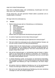 sogar durch einige Kinderspielzeuge. Aber nicht nur Menschen leiden unter Lärmbelastung. Auswirkungen sind inzwi− schen auch in der Fauna feststellbar. All das zwingt dazu, sich dem genannten Problem stärker zuzuwenden und Lö− sungskonzepte zu entwickeln. Wir fragen daher die Landesregierung: A Analyse 1. Welche Untersuchungen gibt es in Brandenburg zur Lärmbelastung a) allgemein b) durch Straßenverkehr c) durch Luftverkehr d) durch Schienenverkehr e) im Berufsleben f) durch Gewerbelärm g) im Freizeitbereich? Werden diese als vergleichende Intervalluntersuchungen geführt? 2. Zu welchen Ergebnissen kommen diese Untersuchungen? 3. Wie bewertet die Landesregierung die Ergebnisse der Untersuchungen? 4. Wie hoch schätzt die Landesregierung den volkswirtschaftlichen Schaden, der auf Lärm zurück zu führen ist, für das Land Brandenburg? 5. Inwiefern finden bei den Untersuchungen zu Lärmauswirkungen unterschied− liche Zielgruppen, wie zum Beispiel Kinder, Menschen mit Behinderungen, äl− tere Menschen usw. Berücksichtigung? Falls keine Unterscheidung der Ziel− gruppen erfolgt: Warum nicht? 6. Wie wird bei Untersuchungen u.a. berücksichtigt, dass bei Kindern in Abhän− gigkeit von der Körpergröße der Abstand zur Lärmquelle, z.B. im Straßenver− kehr, wesentlich geringer als bei einem Erwachsenen sein kann und sich damit Lärmfolgen anders gestalten können? 7. In welchen Bereichen wurden, mit Ausnahme von lärmintensiver Berufstätig− keit, Lärmpegel mit Werten von über 65 dB(A) temporär oder dauerhaft, jeweils unterschieden nach Belastung am Tage und Belastung in der Nacht, festge− stellt? 8. Mit welchem Anteil der städtischen Bevölkerung, der nur bei geschlossenem Fenster ohne Störungen schlafen kann, rechnet die Landesregierung? 9. Wie hoch ist der Anteil der Brandenburger Bevölkerung, der einem nächtlichen Lärmpegel von mehr als 55 dB(A) ausgesetzt ist?