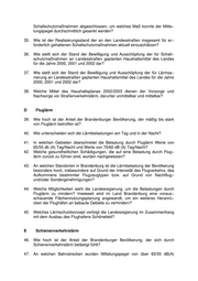 Schallschutzmaßnahmen abgeschlossen; um welches Maß konnte der Mitte− lungspegel durchschnittlich gesenkt werden? 35. Wie ist der Realisierungsstand der an den Landesstraßen insgesamt für er− forderlich gehaltenen Schallschutzmaßnahmen aktuell einzuschätzen? 36. Wie stellt sich der Stand der Bewilligung und Ausschöpfung der für Schall− schutzmaßnahmen an Landesstraßen geplanten Haushaltsmittel des Landes für die Jahre 2000, 2001 und 2002 dar? 37. Wie stellt sich der Stand der Bewilligung und Ausschöpfung der für Lärmsa− nierung an Landesstraßen geplanten Haushaltsmittel des Landes für die Jahre 2000, 2001 und 2002 dar? 38. Welche Mittel des Haushaltsplanes 2002/2003 dienen der Vorsorge und Nachsorge vor Straßenverkehrslärm, darunter unmittelbar und mittelbar? D Fluglärm 39. Wie hoch ist der Anteil der Brandenburger Bevölkerung, der mäßig bis stark von Fluglärm betroffen ist? 40. Wie unterscheiden sich die Lärmbelastungen am Tag und in der Nacht? 41. In welchen Gebieten überschreitet die Belastung durch Fluglärm Werte von 65/55 db (A) Tag/Nacht und Werte von 70/60 dB (A) Tag/Nacht? 42. Welche gesundheitlichen Schädigungen, die auf eine Belastung durch Flug− lärm zurück zu führen sind, wurden nachgewiesen? 43. An welchen Standorten in Brandenburg ist die Lärmbelastung der Bevölkerung besonders hoch, insbesondere auf Grund der Intensität des Flugverkehrs, des Aufkommens bestimmter Flugzeugtypen bzw. auf Grund von Nachtflug− und/oder Sondergenehmigungen? 44. Welche Möglichkeiten sieht die Landesregierung, um die Belastungen durch Fluglärm zu mindern? Inwieweit wird im Land Brandenburg eine voraus− schauende Flächennutzungsplanung angewandt, um ein weiteres Heranrü− cken der Flughäfen an bebaute Gebiete zu verhindern? 45. Welches Lärmschutzkonzept verfolgt die Landesregierung im Zusammenhang mit dem Ausbau des Flughafens Schönefeld? E Schienenverkehrslärm 46. Wie hoch ist der Anteil der Brandenburger Bevölkerung, der sich durch Schienenverkehrslärm belästigt fühlt? 47. An welchen Bahnstrecken wurden Mittelungspegel von über 65/55 dB(A)