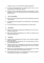 Tag/Nacht, darunter von über 70/60 dB (A) Tag/Nacht festgestellt? 48. Auf welchen Streckenabschnitten des Schienenverkehrs sind noch Lärm− schutzmaßnahmen erforderlich bzw. geplant? 49. Inwieweit nimmt die Landesregierung Einfluss auf die Betreiber von Schie− nenstrecken, mit dem Ziel, dass bevorzugt lärmarme Schienenfahrzeuge zum Einsatz kommen? F Lärm am Arbeitsplatz 50. Wie hat sich die Zahl arbeitsmedizinischer Gehörvorsorgeuntersuchungen seit 1991 entwickelt? 51. In welchen Bereichen (Berufsfeldern) sind Schwerpunkte für Lärmbelastungen erkennbar? 52. Durch welche Maßnahmen sollen diese Belastungen verringert werden? G Gewerbelärm 53. Wie hoch ist der Anteil der Brandenburger Bevölkerung, der sich durch Ge− werbelärm belästigt fühlt? 54. Welche gesundheitlichen Schädigungen sind infolge einer Belastung durch Gewerbelärm dokumentiert? H Freizeitlärm 55. Inwieweit hat die Landesregierung sich bisher mit dem Problem Freizeitlärm auseinander gesetzt? 56. Welche gesundheitlichen Schädigungen sind im Zusammenhang mit Freizeit− lärm nachgewiesen worden? 57. Inwiefern unterstützt die Landesregierung Forschungen bzw. vergleichende Untersuchungen zu Folgen von Lärmeinwirkungen in der Freizeit, z.B. Disco, Konzerte, Großveranstaltungen? 58. Welcher Art von Gesundheitsschäden durch Lärmeinwirkungen in der Freizeit sollte künftig verstärkte Aufmerksamkeit gewidmet werden? 59. Welche Überlegungen gibt es in der Landesregierung in Hinblick auf gesetzli− che Regelungen zu Lärmschutz im Freizeitbereich?
