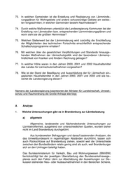 73. In welchen Gemeinden ist die Erstellung und Realisierung von Lärmminde− rungsplänen für Wohngebiete und andere schutzwürdige Gebiete am weites− ten fortgeschritten; in welchen Gemeinden besteht Nachholbedarf? 74. Durch welche Maßnahmen unterstützt die Landesregierung Kommunen bei der Erstellung von Lärmstudien bzw. entsprechenden Lärmminderungsplänen und worin sieht sie die größten Hemmnisse? 75. Welchen Stellenwert bei der Lärmminderung wird zukünftig die Erschließung der Möglichkeiten des technischen Fortschritts einschließlich entsprechender Schallschutzprogramme erhalten? 76. Mit welchen über die gesetzlichen Verpflichtungen und Standards hinausge− henden Maßnahmen der Lärmschutzpolitik wird der besonderen Lärmemp− findlichkeit von Kranken und Kindern Rechnung getragen? 77. In welcher Höhe waren in den Jahren 2000, 2001 und 2002 Haushaltsmittel des Landes für Lärmschutzmaßnahmen vorgesehen? 78. Wie ist der Stand der Bewilligung und Ausschöpfung der für Lärmschutz ein− geplanten Haushaltsmittel in den Jahren 2000, 2001 und 2002 und wie be− wertet die Landesregierung diesen? Namens der Landesregierung beantwortet der Minister für Landwirtschaft, Umwelt− schutz und Raumordnung die Große Anfrage wie folgt: A Analyse 1. Welche Untersuchungen gibt es in Brandenburg zur Lärmbelastung a) allgemein Allgemeine, landesweite und flächendeckende Untersuchungen zur Lärmbetroffenheit, ausgehend von unterschiedlichen Quellen, wurden bisher nicht im Land Brandenburg durchgeführt. Aus bundesweiten Befragungen und darauf basierenden Analysen, die das Umweltbundesamt in regelmäßigen Abständen durchführt, lassen sich auch Rückschlüsse auf Brandenburg ziehen, sowohl weil die Unterschiede zwischen den Bundesländern relativ gering sind als auch, weil Brandenburger sich an den Umfragen beteiligt haben. Das Bundesministerium für Verkehr, Bau und Wohnungswesen (BMVBW) berücksichtigt bei der jeweiligen Überarbeitung des Bundesverkehrswege− planes auch den Faktor Lärm zur Abschätzung der Auswirkungen zur Dis− kussion stehender Neu− oder Ausbaumaßnahmen in den Bereichen Schiene,