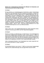 Landtag Brandenburg Drucksache 4/265 4. Wahlperiode Antwort der Landesregierung auf die Kleine Anfrage 52 der Abgeordneten Anita Tack Fraktion der PDS Drucksache 4/117 Wortlaut der Kleinen Anfrage: ÖPNV−Gesetz Im zweiten Gesetz zur Änderung des ÖPNV−Gesetzes, das zum 1.1.2005 in Kraft treten soll, ist neben dem Verkehrsangebot auf dem Eisenbahnnetz eine neue Ka− tegorie "landesbedeutsame Verkehrslinien anderer Verkehrsträger des öffentlichen Personennahverkehrs" aufgenommen worden. Das landesbedeutsame SPNV−Netz kann somit durch entsprechende Verkehrslinien anderer Verkehrsträger des ÖPNV ergänzt werden. Diese gehören dann ebenso zur Aufgabenträgerschaft Land. Ich frage daher die Landesregierung: 1. Welches sind nach gegenwärtigem Stand die landesbedeutsamen Verkehrs− linien anderer Verkehrsträger des öffentlichen Personennahverkehrs"? 2. Wie ist ab dem 1.1.2005 die Finanzierung für diese Verkehrslinien gesichert? 3. Wie erfolgt ab 1.1.2005 die Finanzierung von überregionalen Buslinien, die durch die Abbestellung von Bahnstrecken erforderlich werden? 4. Wie erfolgt die Finanzierung für den Busverkehr auf der abbestellten Bahn− Strecke Rathenow − Neustadt/Dosse ab 2005, der im Jahr 2004 noch mit über 400 T Euro durch das Land finanziert wurde? Datum des Eingangs: 10.12.2004 / Ausgegeben: 15.12.2004