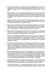 2. In welcher Höhe werden im Jahr 2004 (laut Haushaltsplan) Mittel aus dem Lan− deshaushalt für diese Autorennstrecke bereitgestellt? Bitte nennen Sie den Ein− zelplan, das Kapitel, den Titel, unter dem die Zuweisungen für 2004 zu finden sind. 3. Wie viele Saison− und wie viele Dauerarbeitsplätze wurden durch die bisherigen öffentlichen Zuschüsse in Verbindung mit dem Betrieb des Eurospeedway Lau− sitz geschaffen? Bitte schlüsseln Sie die Zahlen für die Jahre 2000, 2001, 2002 und 2003 auf? Wie viele Menschen befinden sich hier voraussichtlich auch 2004 in Arbeit? 4. Welcher ermittelte Unternehmenswert und welche Gewinnprognosen lagen den diesjährigen Verhandlungen zum Verkauf des Eurospeedway Lausitz zu Grunde? Wer hatte die entsprechenden Gutachten erstellt? 5. Warum muss die öffentliche Hand (und kein Zwischenerwerber) die "Veräuße− rungsfähigkeit" des Lausitzringes durch finanzielle Zuschüsse für den Weiterbe− trieb der Rennstrecke bis 2008 erhalten? Welche Alternativen gab bzw. gibt es hierzu, wurden geprüft, in Erwägung gezogen und warum verworfen? 6. Was versteht die Landesregierung unter einem "Verkaufserlös in substantieller Höhe und mit volkswirtschaftlichen Effekten" für den Eurospeedway Lausitz? Wie wäre ein "substantieller" Verkaufserlös in Euro zu beziffern? 7. Welche "volkswirtschaftlichen Effekte" sollen bzw. können durch den Verkauf des Lausitzringes ausgelöst werden? Welche aktuellen Gutachten und welche fun− dierten Erkenntnisse liegen der Landesregierung hierzu vor? Wo können dies− bezügliche Unterlagen bei der Landesregierung von Mitgliedern des Landtages eingesehen werden? 8. Wie beurteilt der Wirtschaftsminister den eingangs erwähnten und an ihn gerich− teten Brief, insbesondere die von der "Veranstaltungs−GbR am Lausitzring" er− hobenen Vorwürfe gegen das Management des Lausitzrings? Teilt die Landes− regierung nach eingehender Prüfung diese Vorwürfe oder weist sie diese ge− meinsam mit dem Management des Eurospeedway Lausitz zurück? Wenn ja, aus welchen Gründen? 9. Welche offizielle Stellungnahme gibt die Landesregierung zu der Forderung re− gionaler Wirtschaftsunternehmen nach einer Ablösung des Managements des Eurospeedway Lausitz ab? Teilt die Landesregierung nach eingehender Prüfung die Einschätzung, dass mit dem derzeitigen Management ein zweites "Cargolif− ter" drohe und dass es daher falsch sei, weitere Millionen Steuergelder in Zah− lung an die bestehende Geschäftsführung in das Projekt zu investieren? 10. Welche Sofortmaßnahmen ergreift die Landesregierung, um die Einbettung des Eurospeedway Lausitz in die Region und eine enge Verzahnung mit der regio− nalen Wirtschaft bis zur nächsten Saison nunmehr endlich sicher zu stellen? 11. Von welchen Wirtschafts− und Arbeitsplatzprognosen geht die Landesregierung für den Zeitraum 2004 bis 2008 für den Eurospeedway Lausitz aus, die ein neues
