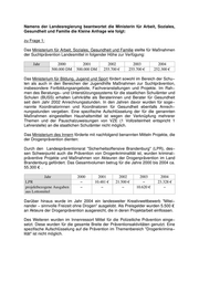 Zudem sind die gemeinsamen Aktivitäten der Zusammenarbeit von Polizei und Schule (Schulpartnerschaften) gemäß dem gemeinsamen Runderlass von MI und MBJS vom 10.09.2002 auch auf die Verstärkung der Drogenprävention ausgerich− tet. Darüber hinaus wird auf Initiative des Landespräventionsrates unter Federfüh− rung des MBJS und unter Einbindung von MASGF, MI, MLUV, MWFK und MdJ ein Rahmenkonzept für die Präventionsarbeit an Schulen des Landes Brandenburg (PIT − Prävention im Team) erarbeitet. Dieses Rahmenkonzept wird als ein Modul auch die Suchtprävention beinhalten. zu Frage 5: Der Bedarf soll wie bisher unter anderem mit Landesmitteln gedeckt werden. Für die Haushaltsjahre 2005 / 2006 sind Landesmittel in der Höhe des Ansatzes der Jahre 2003 / 2004 veranschlagt.