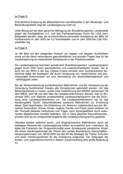 zu Frage 3: Eine jährliche Erfassung der Mitarbeiterinnen und Mitarbeiter in den Beratungs− und Behandlungsstellen liegt der Landesregierung nicht vor. Unter Bezug auf die oben genannte Befragung der Brandenburgischen Landesstelle gegen die Suchtgefahren e.V. und des Fachausschusses Sucht der LIGA kann festgestellt werden, dass die durchschnittliche personelle Ausstattung der BBS mit Fachpersonal im Jahr 2002 bei 3,3 Vollzeitstellen und im Jahr 2004 bei 2,65 Voll− zeitstellen lag. zu Frage 4: Ja. Mit Blick auf den steigenden Konsum von legalen und illegalen Suchtmitteln sowie auf die damit verbundenen gesundheitlichen und sozialen Folgen liegt für die Landesregierung ein wesentlicher Schwerpunkt in der Präventionsarbeit. Die Landesregierung favorisiert gemäß dem Brandenburgischen Landesprogramm gegen Sucht 2001 einen ganzheitlichen und ursachenorientierten Ansatz, wie er auch von der WHO in der sog. Ottawa−Charta vertreten wird. Suchtprävention be− zeichnet dabei die Strategien, die durch Umsetzung von medizinischen und psy− chosozialen Erkenntnissen auf eine Vermeidung von Suchtmittelmissbrauch und −abhängigkeit zielen. Bei der Weiterentwicklung suchtpräventiver Maßnahmen und der Verbesserung der Versorgung Suchtkranker müssen alle Kompetenzen gebündelt werden. Um das Wissenspotenzial zu nutzen, wurde unter Federführung des MASGF gemeinsam mit dem MBJS, dem MI und dem MdJ die Landessuchtkonferenz aktiviert. Das im De− zember 2001 vom Kabinett verabschiedete Landessuchtprogramm sah die Grün− dung einer Landessuchtkonferenz vor. Die Landessuchtkonferenz hat für das Handlungsfeld "Sucht" Gesundheitsziele sowieund Maßnahmen zur Erreichung dieser Ziele beschlossen. Die Einbindung von Akteuren, insbesondere aus den Be− reichen Gesundheit, Schule, Kinder, Jugend, Familie und Polizei sowie weiteren mit der Thematik befasste Institutionen und Träger, kann Synergieeffekte durch aufei− nander abgestimmtes Handeln befördern. Der in Gang gesetzte Gesundheitsziele− prozess wird als ein erfolgreiches Ergebnis des Landessuchtprogramms gewertet. Überdies werden weiterhin sucht− und drogenpräventive Maßnahmen durch die beteiligten Ressorts der Landesregierung initiiert, durchgeführt bzw. unterstützt. So bildet die Prävention der Drogenkriminalität einen Schwerpunkt polizeilicher Arbeit. Mit einem Handlungskonzept der Polizei des Landes Brandenburg (Rauschgiftbe− kämpfungskonzept) vom 09.03.2004 hat das MI die Strategie der Polizei formuliert und einen Handlungsrahmen für die Umsetzung aufgezeigt. Der Zielgruppe der Kinder− und Jugendlichen kommt in diesem Zusammenhang eine große Bedeutung zu.