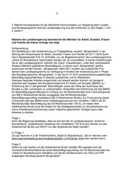 Landtag Brandenburg Drucksache 5/2724 5. Wahlperiode Antwort der Landesregierung auf die Kleine Anfrage 1014 des Abgeordneten Andreas Büttner Fraktion der FDP Drucksache 5/2588 Vergütung im Rahmen des Landesprogramms "Arbeit für Brandenburg" Wortlaut der Kleinen Anfrage Nr. 1014 vom 21.12.2010: Vorbemerkung: Seit dem Start des Landesprogramms „Arbeit für Brandenburg“ am 01. Juli dieses Jahres betont die Landesregierung, dass die Vergütung der Arbeit der Programmteilnehmer mindestens 7,50 Euro beträgt und damit auf Höhe des gesetzlichen Mindestlohnes liegt, den SPD und LINKE seit langem fordern. In der Sitzung des Ausschusses für Arbeit, Soziales, Frauen und Familie am 24. November 2010 wurden die Probleme in der Umsetzung des Landesprogramms kritisiert, die insbesondere darauf zurückzu- führen sind, dass es die Landesregierung verpasst hat, für eine grundsolide finanzielle Absicherung des Programms zu sorgen. In der Folge wurde erneut die Forderung laut, das Landesprogramm durch das Bundesprogramm „Bürgerarbeit“ zu ersetzen. Bei der Bürgerarbeit erhalten Langzeitarbeitslose bei einer Wochenarbeitszeit von 20 Stunden eine Vergütung in Höhe von 720 Euro monatlich. Bei einer wöchentlichen Arbeitszeit von 30 Stunden beträgt der Monatsverdienst 1.080 Euro. Dies entspricht jeweils einer Vergütung von 9 Euro pro Stunde (Arbeitnehmer-Brutto). Der an diesem Tag anwesende Staatssekretär Prof. Dr. Schroeder wies darauf hin, dass die Bürgerarbeit nur als Begleitinstrument zum Landesprogramm „Arbeit für Brandenburg“ in Frage käme, da das Arbeitnehmer-Netto bei der Bürgerarbeit unter der von der Landesregierung angestrebte Mindestvergütung von 7,50 Euro pro Stunde liege. Diese Argumentation wird von den Regierungsfraktionen, Minister Baaske und Prof. Schroeder öffentlich regelmäßig wiederholt. Ich frage die Landesregierung: 1. Kann die Regierung bestätigen, dass es sich bei der im Landesprogramm „Arbeit für Brandenburg“ vorgesehenen Vergütung von mindestens 7,50 Euro pro Stunde um das Arbeitnehmer-Brutto und NICHT um das Arbeitnehmer-Netto handelt? 2. Sofern es sich hierbei um das Arbeitnehmer-Brutto handelt: Wie gestaltet sich der monatliche Bruttoverdienst bei einem Beschäftigungsumfang von 30 Wochenstunden bei „Arbeit für Brandenburg“ im Verhältnis zum Brutto-Verdienst beim von CDU und FDP aufgelegten Bundesprogramm Bürgerarbeit? Datum des Eingangs: 19.01.2011 / Ausgegeben: 25.01.2011