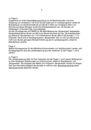 3 zu Frage 2: Ausgehend von einem Beschäftigungsumfang von 30 Wochenstunden und einer Vergütung von mindestens 7,50 € pro Stunde ergibt sich im Landesprogramm „Arbeit für Brandenburg“ ein ArbeitnehmeBrutto pro Monat in Höhe von mindestens 945 €. Zur Berechnung dieses Betrages wurde eine Monatsarbeitszeit von 126 Stunden (21 Arbeitstage x 6 Stunden/Tag) zugrundegelegt. Auf der Grundlage des vom BMAS für die Beschäftigung bei „Bürgerarbeit“ festgelegten MindestArbeitnehmer-Brutto von 900 € pro Monat errechnet sich bei 126 Arbeitsstunden pro Monat ein Stundenlohn von 7,14 € Arbeitnehmer-Brutto (900 €/126 Stunden = 7,14 €/Stunde). Damit wird im Bundesprogramm „Bürgerarbeit“ eine um 45 € pro Monat bzw. 0,36 € pro Stunde geringere Mindest-Entlohnung als im Landesprogramm „Arbeit für Brandenburg“ erreicht. Frage 3: Welche Konsequenzen für die öffentliche Kommunikation zur Vergütung beim Landes- und Bundesprogramm wird die Landesregierung aus den Antworten zu den Fragen 1 und 2 ziehen? zu Frage 3: Die Landesregierung sieht mit ihren Antworten auf die Fragen 1 und 2 keinen Widerspruch zu ihren bisherigen Ausführungen zur Entlohnung bei „Arbeit für Brandenburg“ und „Bürgerarbeit“. Die Vorgaben des BMAS zum Programm „Bürgerarbeit“ können im Übrigen über das Informationsangebot des Bundes im Internet unter www.bmas.bund.de sowie www.bva.bund.de abgerufen werden.