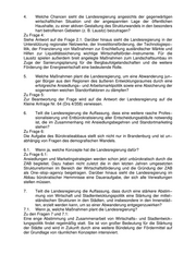 4. Welche Chancen sieht die Landesregierung angesichts der gegenwärtigen wirtschaftlichen Situation und der angespannten Lage der öffentlichen Haushalte, zu einer aktiven Gestaltung des Strukturwandels in den besonders hart betroffenen Gebieten (z. B. Lausitz) beizutragen? Zu Frage 4: Siehe Antwort auf die Frage 2.1. Darüber hinaus sieht die Landesregierung in der Unterstützung regionaler Netzwerke, der Investitionsförderung, der Technologiepo− litik, der Finanzierung von Maßnahmen zur Erschließung ausländischer Märkte und Hilfen zur Liquiditätssicherung wichtige Wirtschaftsförder−Instrumente. Für die Lausitz spielen außerdem breit angelegte Maßnahmen zum Landschaftsumbau im Zuge der Sanierungsplanung für die Bergbaufolgelandschaften und die weitere Förderung der Energiewirtschaft eine bedeutende Rolle. 5. Welche Maßnahmen plant die Landesregierung, um eine Abwanderung jun− ger Bürger aus den Regionen des äußeren Entwicklungsraumes durch eine erfolgreiche Ansiedlungs− und Arbeitsmarktpolitik sowie eine Absicherung der sogenannten weichen Standortfaktoren zu dämpfen? Zu Frage 5: Zur Beantwortung der Frage wird auf die Antwort der Landesregierung auf die Kleine Anfrage Nr. 64 (Drs 4/358) verwiesen. 6. Teilt die Landesregierung die Auffassung, dass eine weitere rasche Profes− sionalisierung und Entbürokratisierung aller Entscheidungsabläufe notwendig ist, die im Zusammenhang mit Ansiedlungsbegehren und Standortmarketing stehen? Zu Frage 6: Die Aufgabe des Bürokratieabbaus stellt sich nicht nur in Brandenburg und ist un− abhängig von Fragen des demografischen Wandels. 6.1. Wenn ja, welche Konzepte hat die Landesregierung dafür? Zu Frage 6.1: Ansiedlungen und Marketingstrategien werden schon jetzt unbürokratisch durch die ZAB begleitet. Dazu haben nicht zuletzt die in den letzten Jahren umgesetzten Strukturreformen im Bereich der Wirtschaftsförderung und die Gründung der ZAB als One−stop−agency beigetragen. Darüber hinaus sieht die Landesregierung im Abbau bürokratischer Hemmnisse eine Daueraufgabe, der sich alle Verwaltungen stellen müssen. 7. Teilt die Landesregierung die Auffassung, dass durch eine stärkere Abstim− mung von Wirtschaft und Stadtentwicklungspolitik eine Stärkung der mittel− ständischen Strukturen in den Städten, und insbesondere in den Innenstäd− ten, erzielt werden kann, um so einer Abwanderung entgegenzuwirken? 7.1. Wenn ja, welche Maßnahmen plant die Landesregierung? Zu den Fragen 7 und 7.1: Eine enge Abstimmung und Zusammenarbeit von Wirtschafts− und Stadtentwick− lungspolitik findet regelmäßig statt. Sie ist von großer Bedeutung für die Stärkung der Städte und wird in Zukunft durch eine weitere Bündelung der Fördermittel auf der Grundlage von räumlichen Konzepten intensiviert.