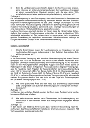 8. Sieht die Landesregierung die Gefahr, dass in den Kommunen das strategi− sche Interesse an Unternehmensansiedlungen den kurzfristigen Interessen an einem ausgeglichenen Haushalt geopfert wird, da eine aktive Wirt− schaftsförderung mit einer spürbaren Aufgabenbelastung verbunden ist? Zu Frage 8: Die Landesregierung ist der Überzeugung, dass die Kommunen ihr Bestreben um eine erfolgreiche Unternehmensansiedlung fortsetzen werden. Mit dem Branden− burgischen Finanzausgleichsgesetz hat das Land wichtige Grundlagen für eine solide kommunale Finanzbasis gelegt und dabei den Schwerpunkt zugleich auf eine investive Verwendung fokussiert. Damit sind auch wichtige Voraussetzungen für eine zielorientierte Wirtschaftsförderung geschaffen worden. Land und Kommunen sind sich darüber im Klaren, dass die längerfristige Sicher− stellung des heutigen Einnahmeniveaus untrennbar mit einer erfolgreichen Wirt− schaftpolitik verbunden ist. Die insbesondere im vergangenen Jahr eingetretene positive Entwicklung der originären kommunalen Steuereinnahmen bestätigt im Übrigen die erzielten Erfolge in der Unternehmensansiedlung. Soziales / Gesellschaft 1. Welche Erkenntnisse liegen der Landesregierung zu Engpässen bei der medizinischen Betreuung, insbesondere in den Gebieten des äußeren Ent− wicklungsraumes, vor? Zu Frage 1: In der ambulanten Versorgung wird von einer Unterversorgung bei einem Versor− gungsgrad von 75 % bei Hausärzten und von 50 % bei anderen Fachärzten aus− gegangen. Demnach besteht gegenwärtig eine Unterversorgung nur für Anästhe− sisten in den Planungsbereichen Ostprignitz−Ruppin und Spree−Neiße sowie für Radiologen in Elbe−Elster. In folgenden Planungsbereichen liegt der Versorgungs− grad für Hausärzte nach Angaben der Kassenärztlichen Vereinigung Brandenburg unter 100 %: Uckermark (83,5 %), Spree−Neiße (87,9 %), Oberspreewald−Lau− sitz (90,9 %), Ostprignitz−Ruppin (95,3 %), Teltow−Fläming (97,6 %) und Havelland (99,4 %). In mehreren Planungsregionen liegt der Versorgungsgrad für alle oder die meisten Arztgruppen deutlich über der Norm mit der Folge von Zulassungssper− ren (ab einem Versorgungsgrad von 110 %). 1.1. Wie viele qualifizierte Ärzte sind seit 1990 aus Brandenburg abgewandert (bitte untergliedert nach äußerem Entwicklungsraum und engerem Verflech− tungsraum)? Zu Frage 1.1: Im Rahmen der amtlichen Statistik werden bei Fort− oder Zuzügen keine berufs− bezogenen Merkmale erhoben. 1.2. Wie viele Arztpraxen werden nach Erkenntnissen der Landesregierung vo− raussichtlich in den nächsten Jahren aus Altersgründen aufgegeben werden müssen? Zu Frage 1.2: In den Jahren von 2002 bis 2010 wurden bzw. werden in Brandenburg nach Be− rechnungen des Wissenschaftlichen Instituts der Ortskrankenkassen insgesamt 753 Vertragsarztsitze aus Altersgründen frei.
