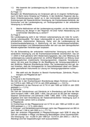 1.3. Wie bewertet die Landesregierung die Chancen, die Arztpraxen neu zu be− setzen? Zu Frage 1.3: Bezüglich der Wiederbesetzung von Arztpraxen gibt es im engeren Verflechtungs− raum mit Berlin keine Hinweise auf Probleme. In den ländlichen Regionen des äu− ßeren Entwicklungsraumes bedarf es in den kommenden Jahren gemeinsamer Anstrengungen der Kassenärztlichen Vereinigung, der Krankenkassenverbände, der Kommunen und der Landesregierung, um Versorgungslücken in der ambulanten Versorgung zu vermeiden. 2. Welche Maßnahmen will die Landesregierung ergreifen, um die medizinische Betreuung der Bürger in den Regionen mit einer hohen Abwanderung und zunehmender Überalterung zu sichern? Zu Frage 2: Die Landesregierung sieht in der höheren Lebenserwartung ein Indiz für zuneh− mende Lebensqualität. Teil dieser Lebensqualität ist auch die Sicherstellung der erforderlichen medizinischen Betreuung. Daher wird die Landesregierung die Krankenhausbedarfsplanung in Abstimmung mit den Krankenkassenverbänden, Krankenhausträgern und Gebietskörperschaften den sich aus dem demografischen Wandel ergebenden Veränderungen anpassen. Für die Sicherstellung der ambulanten medizinischen Versorgung sind die Kas− senärztliche Vereinigung und die Krankenkassenverbände verantwortlich. Das am 1.1.2004 in Kraft getretene GKV−Modernisierungsgesetz, das unter Mitwirkung der Landesregierung zustande gekommen ist, eröffnet Möglichkeiten zur Bildung neuer Versorgungsformen (medizinische Versorgungszentren, integrierte Versorgungs− netze), die eine gute Grundlage für die Bewältigung der Versorgungsprobleme in den ländlichen Regionen Brandenburgs bieten. Die Landesregierung wird ggf. da− rauf hinwirken, dass die Vertragspartner im Gesundheitswesen diese vom Gesetz− geber geschaffenen Instrumente zur Lösung von Versorgungsproblemen nutzen. 3. Wie stellt sich die Situation im Bereich Krankenhäuser, Zahnärzte, Physio− therapie und Pflegeberufe dar? Zu Frage 3: a) Personal in den Krankenhäusern: Die Zahl der in den Krankenhäusern Brandenburgs tätigen Ärztinnen und Ärzte ist von 3.378 im Jahr 1999 auf 3.747 im Jahr 2003 gestiegen (= + 10,9 %). Im Pflegebereich ist das Personal von 9.716 im Jahr 1999 auf 9.839 im Jahr 2003 gestiegen (= + 1,3 %). b) Zahnärzte: Die Zahl der Zahnärztinnen und Zahnärzte ist in Brandenburg seit Ende der 90er Jahre konstant (1999: 1.838; 2000: 1.834). Das gilt auch für die Zahl der niederge− lassenen Zahnärztinnen und Zahnärzte (1999: 1.669, 2003: 1.679). Versorgungs− engpässe sind nach Einschätzung der Kassenzahnärztlichen Vereinigung auch in den kommenden Jahren nicht zu erwarten. c) Pflegeberufe Im Krankenhaus ist das Pflegepersonal von 9.716 im Jahr 1999 auf 9.839 im Jahr 2003 gestiegen (= + 1,3 %; siehe oben). In Vorsorge− und Rehabilitationseinrichtungen nahm das Pflegepersonal von 865 im Jahr 1999 auf 1.108 im Jahr 2003 zu (= + 17,7 %). Nach der amtlichen Pflegestatistik in Pflegeeinrichtungen nach SGB XI stieg die Zahl der unmittelbar in Pflege und Betreuung Beschäftigten (ohne hauswirtschaftli− che Versorgung) von 10.259 im Jahr 1999 auf 13.019 im Jahr 2003 (= + 26,9 %). Allerdings sind hier Doppelzählungen nicht auszuschließen.