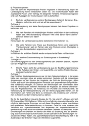 d) Physiotherapeuten: Über die Zahl der Physiotherapie−Praxen insgesamt in Brandenburg liegen der Landesregierung keine verlässlichen Daten vor. Die Krankenkassen haben 889 zugelassene Praxen unter Vertrag, mit steigender Tendenz. Versorgungsengpässe sind nach Aussagen der Krankenkassen nicht zu befürchten. 4. Sind der Landesregierung weitere Berufsgruppen bekannt, bei denen Eng− pässe zu befürchten sind, und wie will sie gegensteuern? Zu Frage 4: Der Landesregierung sind keine Berufsgruppen bekannt, bei denen Engpässe zu befürchten sind. 5. Wie viele Familien mit minderjährigen Kindern und Kindern in der Ausbildung haben seit 1990 Brandenburg verlassen? Wie viele davon waren alleiner− ziehende Mütter bzw. Väter? Zu Frage 5: Hierzu liegen der Landesregierung keine statistischen Informationen vor. 6. Wie viele Familien bzw. Paare aus Brandenburg führen eine sogenannte "Fernbeziehung", weil ein Partner oder eine Partnerin einen Arbeitsplatz in den alten Bundesländern angenommen hat? Zu Frage 6: Im Rahmen der amtlichen Statistik werden entsprechende Daten nicht erhoben. 6.1. Gibt es einen Zusammenhang zur Scheidungsrate in Brandenburg? Zu Frage 6.1: Der Scheidungsgrund ist kein Erhebungsmerkmal der amtlichen Statistik. Insofern kann die Frage nicht beantwortet werden. 7. Welche Folgen zieht die Landesregierung aus der Bevölkerungsentwicklung für die Aufgaben der Kinder− und Jugendhilfe, und welche Problemlösungs− strategien bestehen dazu? Zu Frage 7: Das Politikfeld Kindertagesbetreuung war mit dem Geburtenrückgang in der ersten Hälfte der neunziger Jahre als erstes konfrontiert. Deshalb sind die notwendigen Anpassungen bei der Struktur der Angebote, der Zahl der Einrichtungen, deren Größe, aber auch beim pädagogischen Personal zum gegenwärtigen Zeitpunkt be− reits vollständig vollzogen. Im Zentrum der Bemühungen der kommenden Jahre wird die Erhöhung der zeitlichen Flexibilität der Angebote, die weitere Differenzie− rung der Angebotsformen, die Förderung von Pluralität und Interkulturalität, die Verbesserung der Bildungsförderung und der Betreuungsqualität stehen, um die Vereinbarkeit von Familie und Beruf zu verbessern, die Ansiedlung von Unterneh− men zu fördern und den Kinderwunsch zu stärken. Die für die Jugendarbeit relevante Gruppe der 14− bis unter 21−Jährigen wird sich 2010 gegenüber 2004 halbieren. Nötig wird innerhalb der Jugendamtsbereiche eine möglichst kleinräumige Prognose, um auf dieser Grundlage zu einer quantitativen und qualitativen Bedarfseinschätzung zu kommen. Dabei ist unter anderem das Verhältnis von Jugendfreizeitarbeit und Angeboten der Jugendsozialarbeit/Ju− gendberatung in den sozial am stärksten belasteten Gebieten zu überprüfen. In den Einrichtungen und Diensten im Bereich der Hilfen zur Erziehung wird die Entwick− lung auch Auswirkungen auf die Kosten und die Zahl der in den Einrichtungen vor− zuhaltenden Plätze haben. Die jugendhilfeplanerische Berücksichtigung fällt in die Zuständigkeit der örtlichen Träger der öffentlichen Jugendhilfe.