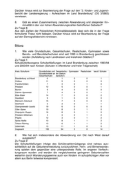 Darüber hinaus wird zur Beantwortung der Frage auf den "3. Kinder− und Jugend− bericht der Landesregierung − Aufwachsen im Land Brandenburg" (DS 3/5865) verwiesen. 8. Gibt es einen Zusammenhang zwischen Abwanderung und steigender Kri− minalität in den von hohen Abwanderungszahlen betroffenen Gebieten? Zu Frage 8: Aus den Zahlen der Polizeilichen Kriminalitätsstatistik lässt sich die in der Frage formulierte These nicht belegen. Darüber hinaus wird zur Beantwortung der Frage auf den Demografiebericht verwiesen. Bildung 1. Wie viele Grundschulen, Gesamtschulen, Realschulen, Gymnasien sowie Berufs− und Berufsfachschulen sind seit 1990 in Brandenburg geschlossen worden (Aufstellung nach Landkreisen und kreisfreien Städten)? Zu Frage 1: Schulstufenbezogene Schulschließungen im Land Brandenburg zwischen 1993/94 und 2003/04 nach Kreisen (Schulen in öffentlicher und freier Trägerschaft) Kreis /Schulform Grundschulen und Gesamtschu− Gymnasien Realschulen berufl. Schulen Grundschulteile an len (Sekun− Gesamtschulen darstufe I) Brandenburg a.d.Havel 6 1 0 0 1 Cottbus 11 5 0 0 0 Frankfurt(Oder) 7 4 0 1 0 Potsdam 12 5 0 0 1 Barnim 9 4 0 0 0 Dahme−Spreewald 7 4 0 0 1 Elbe−Elster 14 7 0 0 2 Havelland 9 1 0 0 0 Märkisch−Oderland 15 7 0 0 0 Oberhavel 5 3 0 1 1 Oberspreewald−Lausitz 19 6 0 0 0 Oder−Spree 10 8 0 1 0 Ostprignitz−Ruppin 16 8 0 1 0 Potsdam−Mittelmark 4 3 0 1 2 Prignitz 12 3 0 1 2 Spree−Neiße 13 8 1 1 2 Teltow−Fläming 13 6 1 1 2 Uckermark 13 11 1 0 0 Insgesamt 195 94 3 8 14 2. Wie hat sich insbesondere die Abwanderung von Ost nach West darauf ausgewirkt? Zu Frage 2: Die Schulschließungen infolge des Schülerzahlenrückgangs sind nahezu aus− schließlich auf die Geburtenentwicklung zurückzuführen. Fern− und Binnenwande− rung spielen dem gegenüber eine untergeordnete Rolle. Im engeren Verflech− tungsraum wurden und werden die vergleichsweise geringeren Geburtenzahlen weiterhin durch Wanderungsgewinne auch von Kindern im schulpflichtigen Alter vor allem aus Berlin teilweise kompensiert.