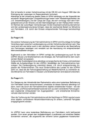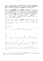 deckung dazu führen würden, dass die Verkehrsbetriebe weitere Ausgleichsforderun- gen an den Veranlasser richten würden. Zum anderen würde die Attraktivität von Bussen und Straßenbahnen für die anderen Fahrgäste deutlich vermindert. Auch eine kostenfreie Beförderung von Fahrrädern im Regionalverkehr kann von Landesseite (SPNV-Aufgabenträger) nicht befürwortet werden, da die sich daraus ergebenden Einnahmeverluste - aufgrund der analog zum üÖPNV ebenfalls schon gegebenen Kostenunterdeckung - vom Veranlasser zu trägen wären. Das würde bedeuten, dass die mit der Tarifierung der Fahrradmitnahme beabsichtigte Nachfrage- regulierung, um so den Regionalverkehr zu erträglichen Kosten durchführen zu können, entfallen und somit zu einer dauerhaften Erhöhung des vom SPNV-Aufgaben- träger zu zahlenden Zuschussbedarfs führen würde. Dies würde zweifelsfrei voraus- sichtlich höhere Fahrpreise zur Folge haben. Des weiteren ist zu berücksichtigen, dass die Fahrradmitnahme in direkter Konkurrenz zur Anmietung von Fahrrädern in den Brandenburger Reisegebieten durch die teil- weise bereits sehr leistungsfähigen Vermietfirmen steht. Eine kostenfreie Fahrradmit- nahme wäre ein Dumpingangebot, das auf diesen Teil der Brandenburger Wirtschaft negativ wirken würde. Zu Frage 4.12: Die sich aus einer kostenfreien Fahrradmitnahme ergebenden Einnahmeausfälle können zurzeit weder für den ÖPNV noch für SPNV beziffert werden. V. Verkehrssicherheit Zu Frage 5.1: Bei der statistischen Erfassung von Verkehrsunfällen unter Beteiligung von Fahr- radfahrern wird nicht zwischen der Benutzung von Fahrradstreifen und Fahrradwegen unterschieden. Eine gezielte Auswertung des Unfallgeschehens auf Strecken mit markierten Fahrradstreifen ergab keine Auffälligkeiten. Die Anlagekosten eines Radfahrstreifens, der in einer Breite von möglichst 1,85 m angelegt werden sollte, belaufen sich etwa auf das dreifache im Vergleich zu einem separat angelegten Radweg. Radfahrstreifen gehören konstruktiv zur Fahrbahn und müssen dementsprechend aufwändiger gebaut werden. Die höheren Kosten werden außerdem durch zusätzliche Aufwendungen für die Entwässerung der Fahrbahn, die Errichtung von passiven Schutzeinrichtungen zwischen Radfahrstreifen und Fahrbahn sowie in Brandenburg häufig durch das notwendige Fällen von Straßenbäumen verursacht. Aus Verkehrssicherheitsgründen ist der separate Radweg ebenfalls dem Radfahrstreifen vor- zuziehen. Konflikte zwischen Kraftfahrzeugverkehr und Radfahrer können bei Radwegen fast ausschließlich nur an den Knotenpunkten auftreten.