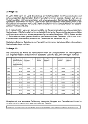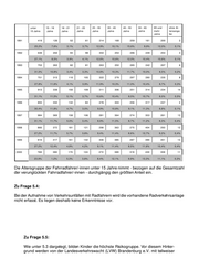 unter 15 - 18 18 - 21 21 - 25 25 - 35 35 - 45 45 - 55 55 - 65 65 und ohne Al- 15 Jahre Jahre Jahre Jahre Jahre Jahre Jahre Jahre mehr tersanga- Jahre be 1991 419 126 52 61 214 168 259 161 200 2 25,2% 7,6% 3,1% 3,7% 12,9% 10,1% 15,6% 9,9% 12,0% 0,1% 1992 648 202 94 98 302 254 286 249 254 3 27,1% 8,5% 3,9% 4,1% 12,6% 10,6% 12,0% 10,4% 10,6% 0,1% 1993 753 263 82 81 263 250 285 242 207 6 31,0% 10,8% 3,4% 3,3% 10,8% 10,3% 11,7% 10,0% 8,5% 0,2% 1994 751 313 110 105 322 279 297 280 235 8 27,8% 11,6% 4,1% 3,9% 11,9% 10,3% 11,0% 10,4% 8,7% 0,3% 1995 913 338 150 109 311 306 251 314 234 14 31,1% 11,5% 5,1% 3,7% 10,6% 10,4% 8,5% 10,7% 8,0% 0,5% 1996 855 332 132 84 278 303 256 317 247 4 30,4% 11,8% 4,7% 3,0% 9,9% 10,8% 9,1% 11,3% 8,8% 0,1% 1997 984 369 158 106 281 364 274 353 261 13 31,1% 11,7% 5,0% 3,4% 8,9% 11,5% 8,7% 11,2% 8,3% 0,4% 1998 866 372 181 121 298 363 275 404 293 12 27,2% 11,7% 5,7% 3,8% 9,4% 11,4% 8,6% 12,7% 9,2% 0,4% 1999 919 417 161 142 308 385 287 390 351 13 27,2% 12,4% 4,8% 4,2% 9,1% 11,4% 8,5% 11,6% 10,4% 0,4% 2000 769 380 170 124 272 389 319 430 359 11 23,9% 1,2% 5,3% 3,8% 8,4% 12,1% 9,9% 13,3% 11,1% 0,3% Die Altersgruppe der Fahrradfahrer/-innen unter 15 Jahre nimmt - bezogen auf die Gesamtzahl der verunglückten Fahrradfahrer/-innen - durchgängig den größten Anteil ein. Zu Frage 5.4: Bei der Aufnahme von Verkehrsunfällen mit Radfahrern wird die vorhandene Radverkehrsanlage nicht erfasst. Es liegen deshalb keine Erkenntnisse vor. Zu Frage 5.5: Wie unter 5.3 dargelegt, bilden Kinder die höchste Risikogruppe. Vor diesem Hinter- grund werden von der Landesverkehrswacht (LVW) Brandenburg e.V. mit teilweiser