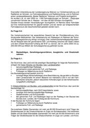 finanzieller Unterstützung der Landesregierung Aktionen zur Verkehrserziehung und Radfahren an Schulen, zur Fahrradausbildung und Radfahrprüfung, und im Rahmen eines Landeswettbewerbs „Bester Radfahrer“ Aktionen und Projekte durchgeführt. So wurden z.B. im Jahr 2000 ca. 1.500 Fahrradprüfungen an Schulen - Zielgruppe vornehmlich Schüler der 4. Klassen - mit über 40.000 Schülern durchgeführt. Darüber hinaus werden Veranstaltungen durchgeführt, im Rahmen derer Fahrräder auf ihre Verkehrssicherheit hin geprüft werden und bei denen auf entsprechenden Fahrradparcours die Geschicklichkeit getestet werden kann. Zu Frage 5.6: Die Verkehrssicherheit hat wesentliches Gewicht bei der Prioritätenreihung infra- struktureller Maßnahmen. Die Verbesserung von Radwegen im Rahmen der Schul- und Spielwegesicherung erfolgt vorrangig unter Verkehrssicherheitsgesichtpunkten. Als ein Beispiel wäre der gemeinsame Geh- und Radweg zwischen der Stadt Lübben und dem Ortsteil Neuendorf entlang der B 87 zu nennen, der im Jahre 2000 mit ca. 200.000 DM aus Mitteln der Schulwegsicherung gefördert wurde. VI. Baulastträger, Genehmigungsverfahren, Ausgleichs- und Ersatzmaß- nahmen Zu Frage 6.1: Der Bund bzw. das Land sind die jeweiligen Baulastträger für folgende Radverkehrs- anlagen der freien Strecke von Bundes- bzw. Landesstraßen: C benutzungspflichtige Radwege, C gemeinsame sowie getrennte Fuß- und Radwege, C Fußwege zur Mitbenutzung durch Radfahrer. Die Baulastträgerschaft besteht auch für C sonstige Wege (Wirtschaftswege) ohne Beschilderung, die parallel zur Bundes- oder Landesstraße mit einem Abstand von höchstens 3,50 m von der Fahr- bahnkante verlaufen, jedoch reduzierten Anforderungen an die Verkehrssiche- rungspflicht unterliegen. In Ortsdurchfahrten von Bundes- und Landesstraßen ist der Bund bzw. das Land der Baulastträger für: C benutzungspflichtige, nach StVO beschilderte, sowie C sonstige nicht benutzungspflichtige Radwege, C Radfahrstreifen und Schutzstreifen. C Bei getrennten Fuß- und Radwegen liegt nur der Radweg in der Baulast des Bundes bzw. Landes, der Fußweg bei der Kommune. In der Baulast der Kommune liegen: C Fußwege zur Mitbenutzung durch Radfahrer sowie C gemeinsame Fuß- und Radwege Die kreisfreien Städte (Gemeinden mit mehr als 80.000 Einwohnern) sind Träger der Straßenbaulast für die Ortsdurchfahrten im Zuge von Bundesstraßen. Die kreisfreien Städte und die Stadt Eberswalde (Gemeinden mit mehr als 50.000 Einwohnern) sind Träger der Straßenbaulast für die Ortsdurchfahrten im Zuge von Landes- und Kreis-